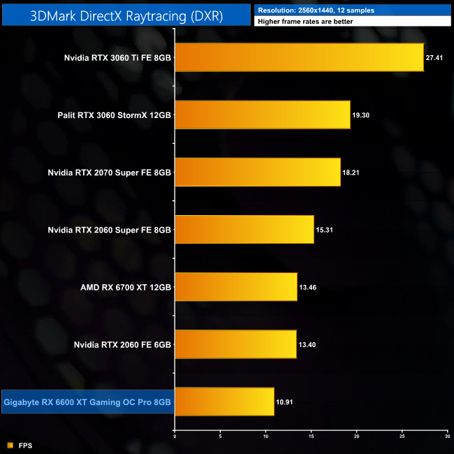 We know AMD isn't as strong when it comes to ray tracing, and using the 3DMark DXR Featuretest – which is entirely ray traced – we can see the RX 6600 XT is slower than even the RTX 2060 which launched over 2 years ago. Put it another way – the RTX 3060 Ti isn't far off being three times as fast.