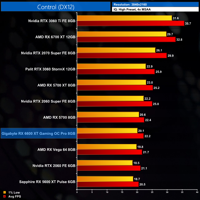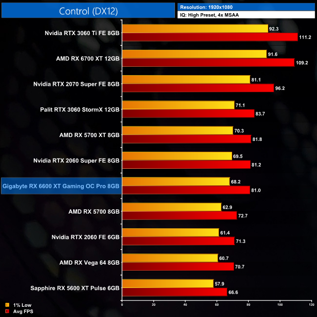 Moving from one AMD-sponsored title to one sponsored by Nvidia, and the RX 6600 XT delivers an average of 81FPS in Control, at 1080p. That does make it fractionally slower than the RTX 3060 here, but realistically there's no difference between either of those GPUs, or the RX 5700 XT and 2060 Super, as they're all within a couple of frames of each other.