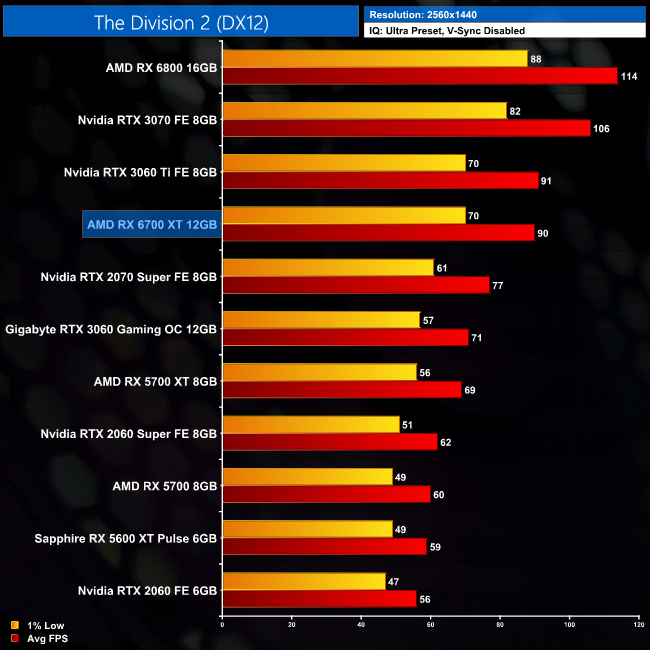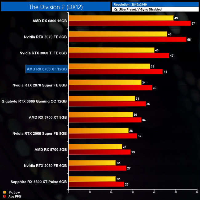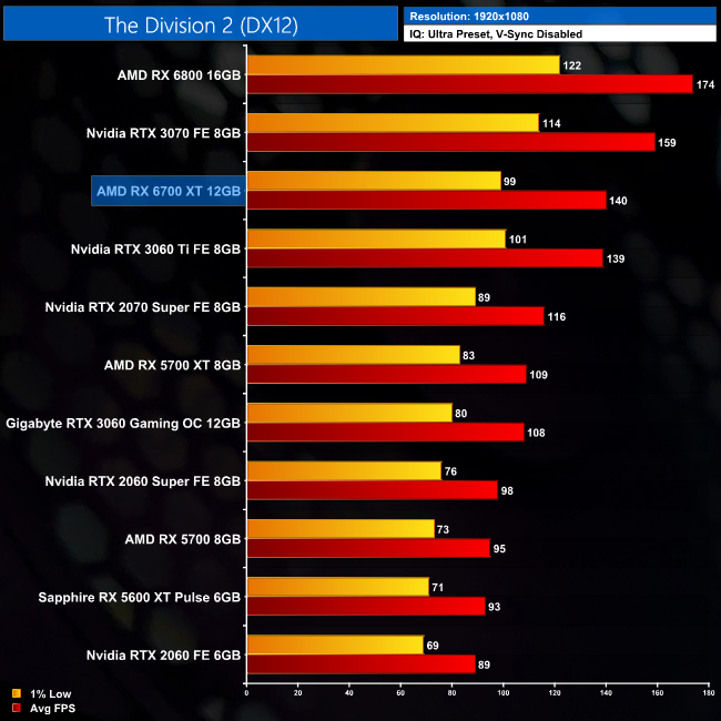 As for The Division 2, despite being an AMD title, at 1080p we can see the 6700 XT is trailing the RTX 3070 by a 12% margin, while it's also just a single frame faster than the RTX 3060 Ti. Against the RX 6800, we're looking at a pretty large 20% gap between the two.