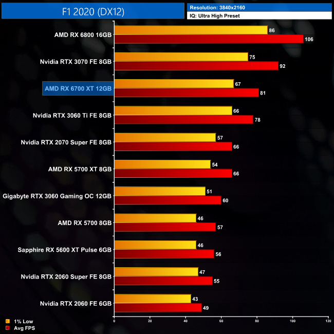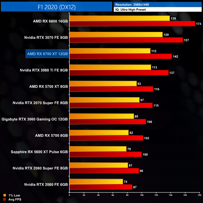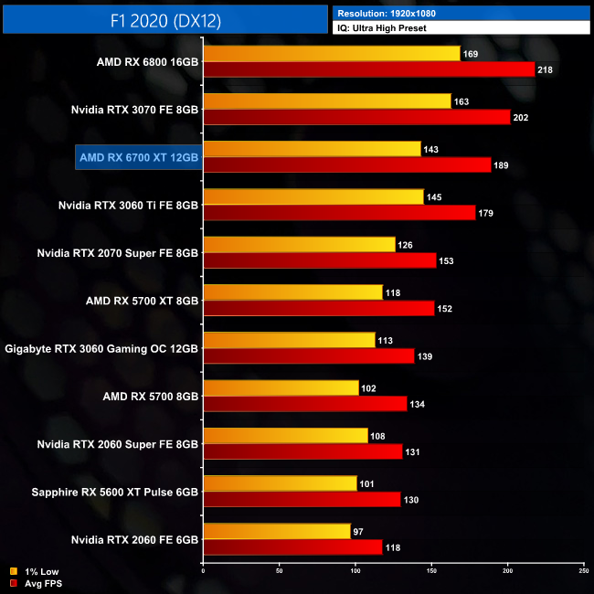 One of the least demanding games we test, F1 2020 sees the 6700 XT average 189FPS at 1080p, where it's just 6% behind the RTX 3070. It's also 6% faster than the RTX 3060 Ti, so it is bang in the middle between those two GeForce GPUs.
