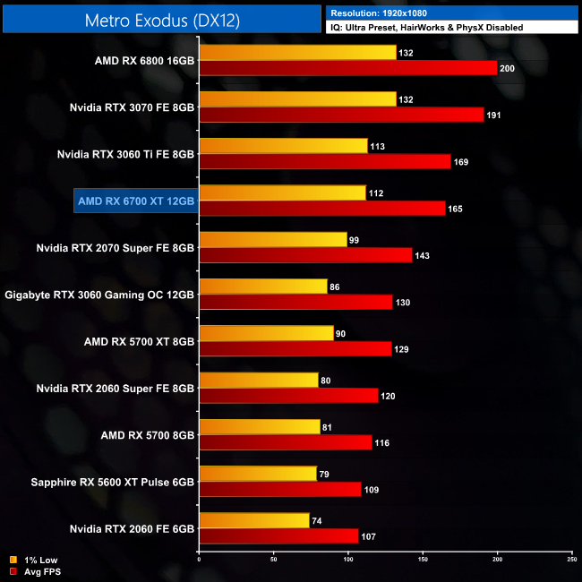 Moving on from one AMD-friendly game, to a title that definitely favours GeForce hardware. At 1080p in Metro Exodus, the RX 6700 XT is 14% slower than the RTX 3070, and is even a touch behind the RTX 3060 Ti. It's still delivering great frame rates, but we'd have hoped for better compared to Nvidia's cards.