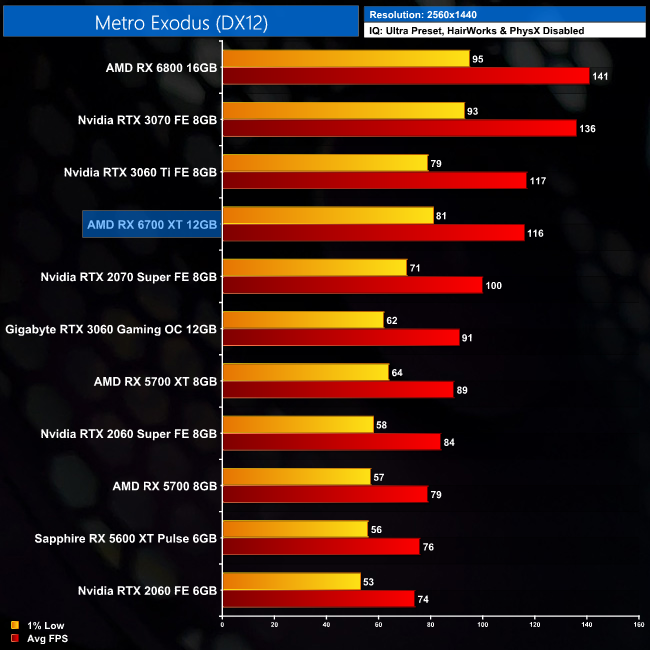 The same goes for the 1440p data. Here, the 6700 XT is soundly beaten by the RTX 3070, to the tune of 15%, while it just about matches the RTX 3060 Ti, with both around the 116FPS mark. We're also looking at a 20% deficit compared to the RX 6800.