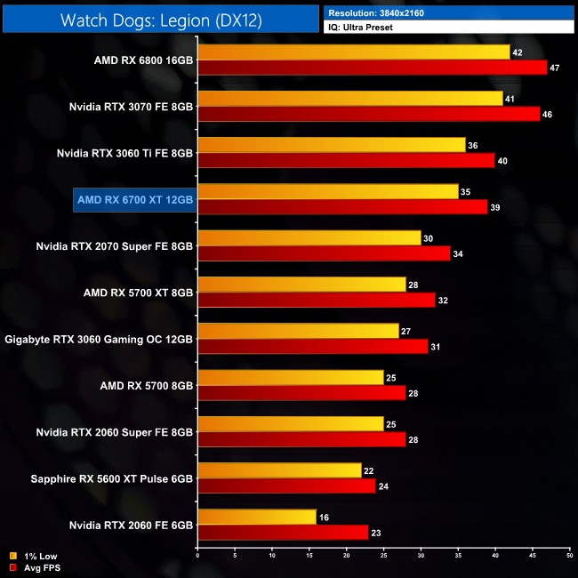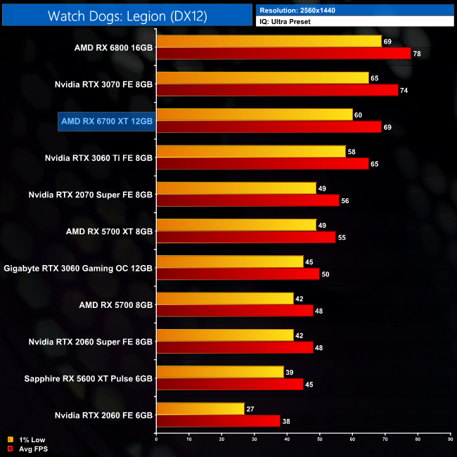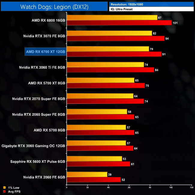 Finally we come to Watch Dogs: Legion. Despite being an Nvidia-sponsored title, the results for the 6700 XT aren't bad at all. It's only 3FPS slower than the RTX 3070 at 1080p, and sits 8% above the RTX 3060 Ti.