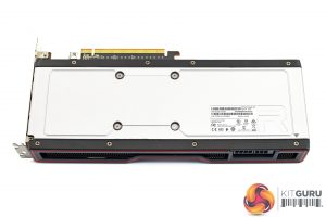On the front side of the card, we can see the same red trim going around the edge of the shroud as found on the RX 6800. The backplate, too, is the same silver and black metal, though there isn't a cut-out behind the GPU die now – it's a full piece of metal, with just four small holes for the GPU mounting screws.