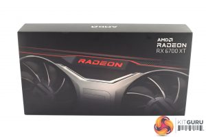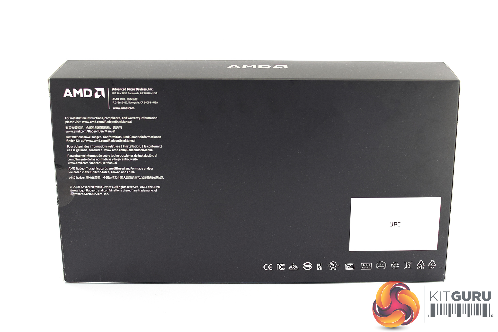 The AMD RX 6700 XT reference card ships in the same style of box as the RX 6800. It's compact and almost entirely black, with a semi-obscured image of the graphics card's shroud visible on the front. The back is left mostly bare, apart from a few paragraphs of text in the upper left corner.