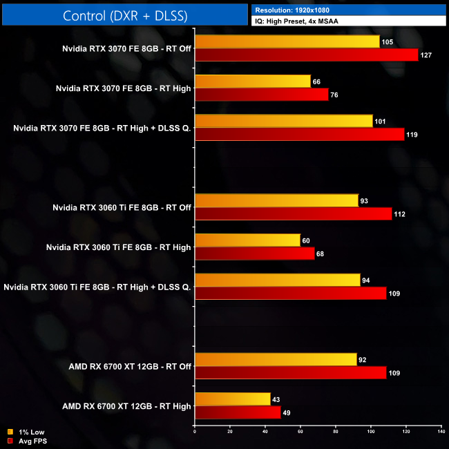 Nvidia GPUs do have the option of DLSS in Control as well, something AMD currently has no answer for. At 1080p, we can see the RTX 3060 Ti is able to hit 109FPS on average using DLSS quality mode with ray tracing set to high. That's the same level of performance as the RX 6700 XT running with no ray tracing at all, so it's a clear advantage for Nvidia in this title.