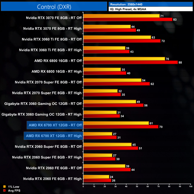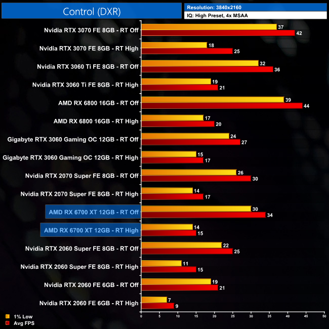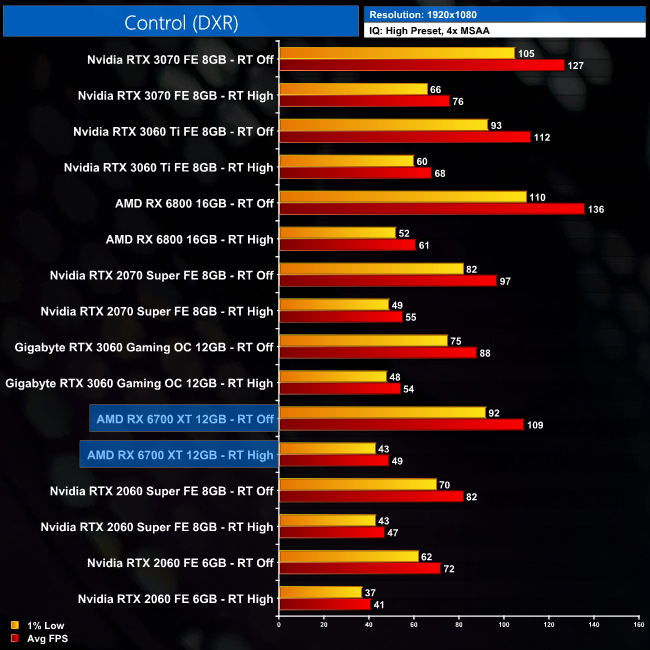 Looking now at ray tracing performance for the RX 6700 XT, we'll start with Control. Here, the 6700 XT only delivers a playable frame rate at 1080p, offering 49FPS on average with ray tracing set to High. That's a huge frame rate drop compared to playing with ray tracing disabled however, as we're looking at a 55% hit. The 6700 XT is only just faster than the RTX 2060 Super here, a £379 GPU from mid-2019.