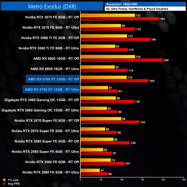 As for Metro Exodus, we experienced a number of crashes when using DXR in this game, but eventually we gathered the necessary data for comparison. At 1080p, the RX 6700 XT averaged 91FPS with ray tracing set to Ultra, putting it on par with the RTX 3060 and RTX 2070 Super. Compared to the RTX 3060 Ti, however, it's 20% slower.