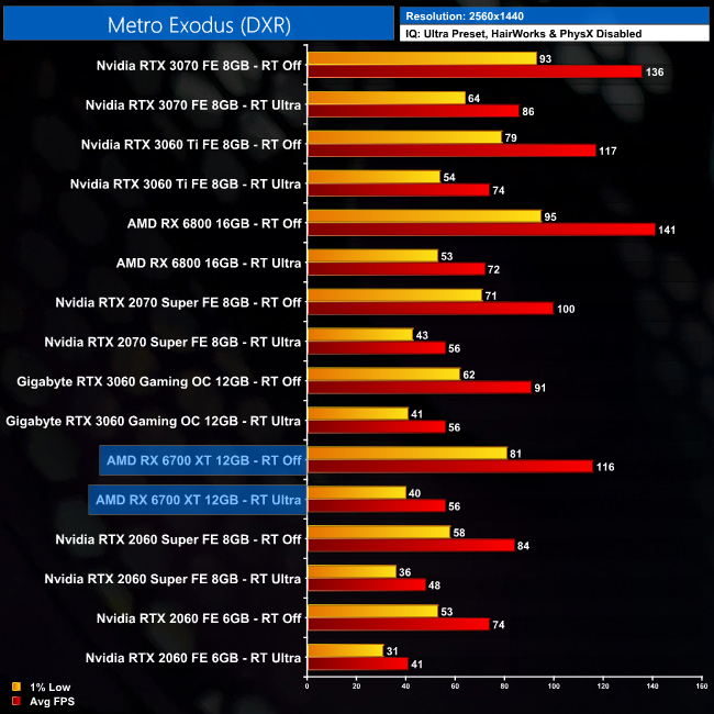 I'd say 1440p gaming is possible here too, with the 6700 XT averaging 56FPS, though the 1% lows drop down to 40FPS. Compared to the RTX 3060 Ti however, AMD's GPU is 24% slower with ray tracing enabled.