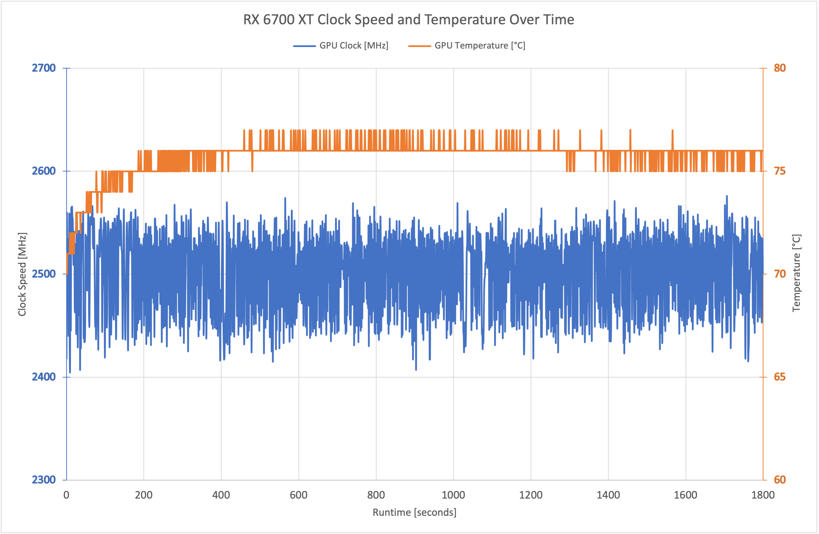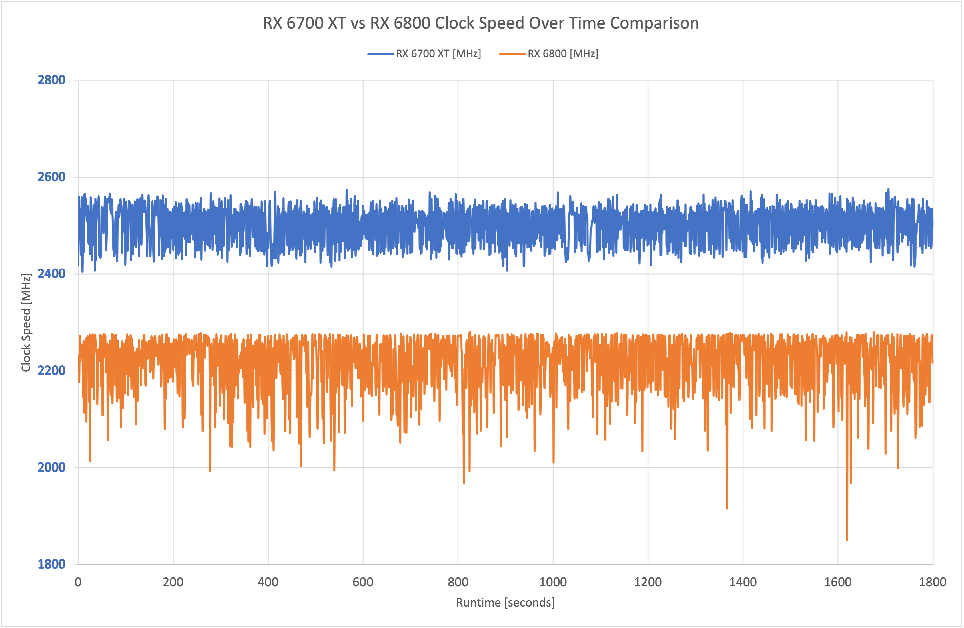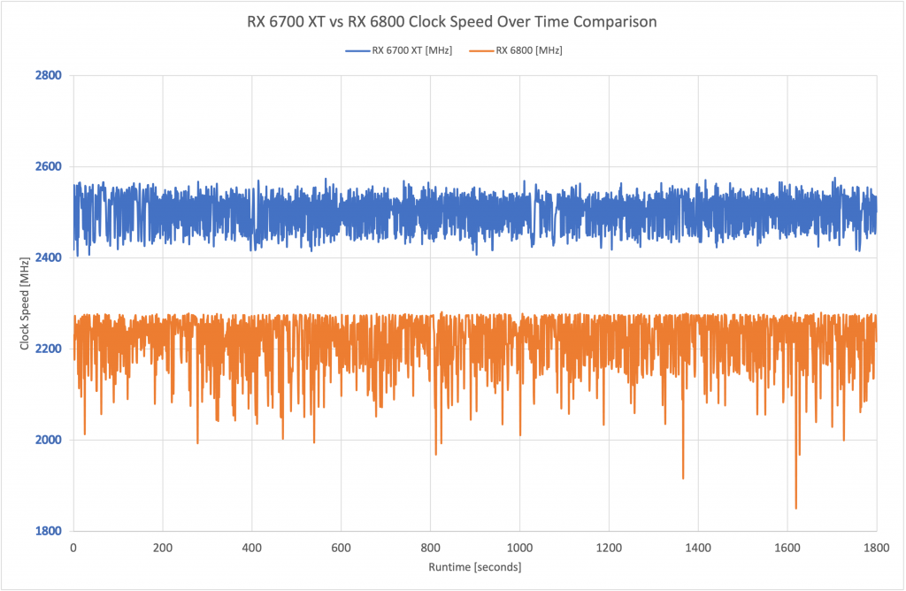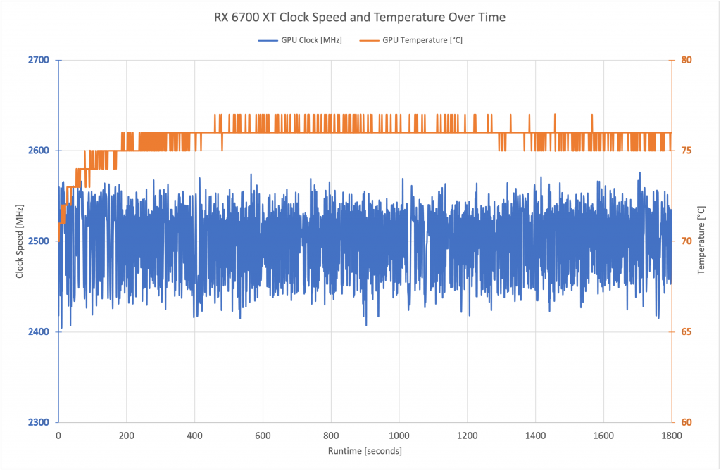 Looking at the operating speeds of the RX 6700 XT, it is no surprise to see the GPU running at a much higher clock than any other GPU we've tested. AMD claims a game clock of 2424MHz, and over the duration of our 30 minute stress test we saw an average frequency of 2501MHz. Compared to the RX 6800 in our scatter graph, we can also see the frequency certainly seems more stable, with fewer and less significant downward spikes.