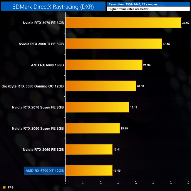 Our first indication of ray tracing performance is… not good. In the 3DMark DXR feature test, the RX 6700 XT is matching the RTX 2060, Nvidia's lowest-end GPU from its first generation of RTX hardware. This test is entirely ray traced, so it doesn't tell us how the card will perform in hybrid-rendered scenarios (which is the majority of games that use ray tracing right now), but from a pure ray tracing perspective, it's significantly slower than any Ampere GPU on the market.