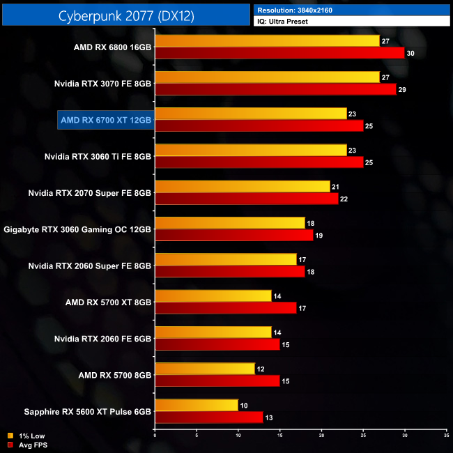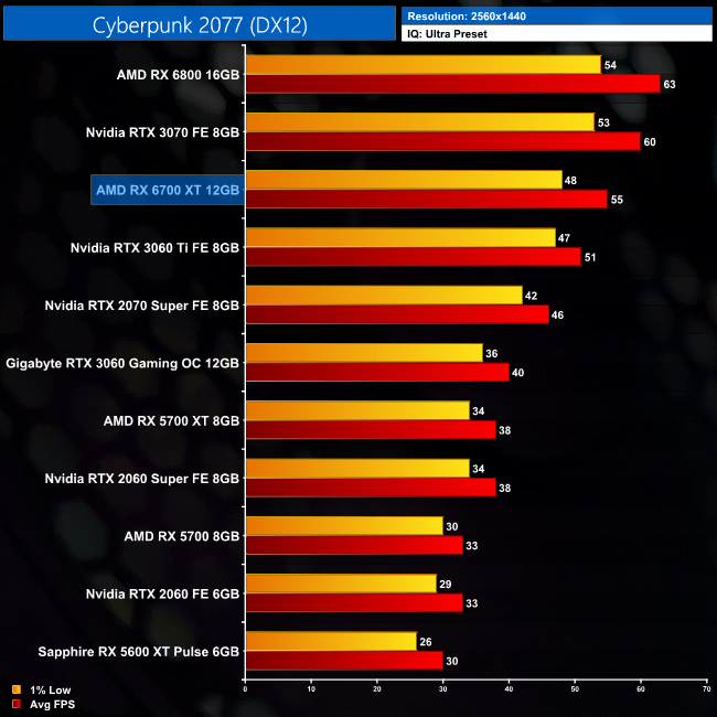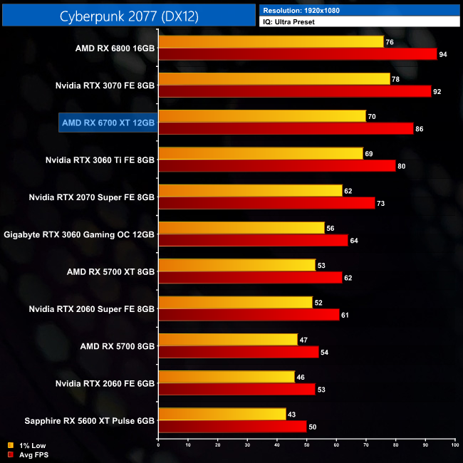 Next up we come to Cyberpunk 2077, the most demanding game of the 12 we're testing today. At 1080p, the RX 6700 XT delivers 86FPS on average, meaning it sits pretty neatly between the 3060 Ti and the 3070.