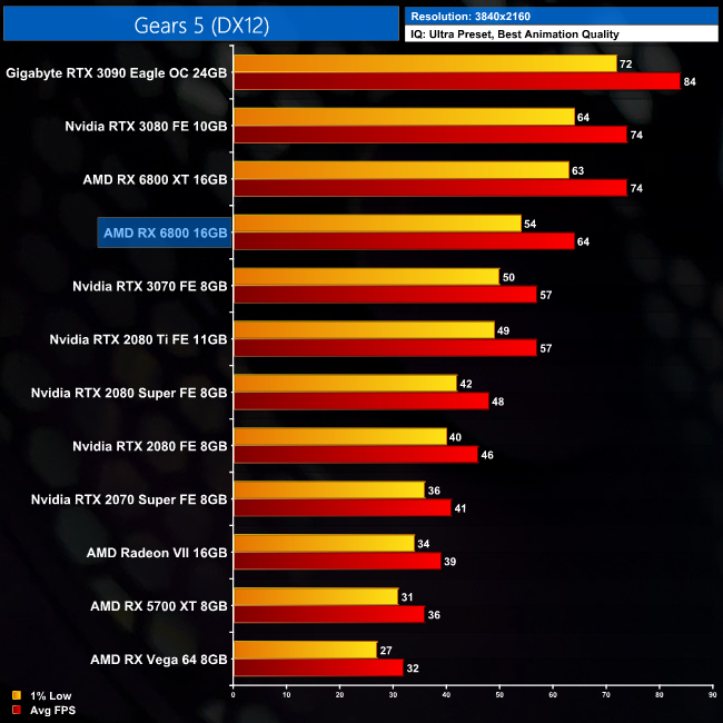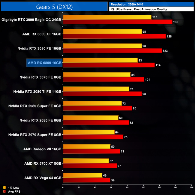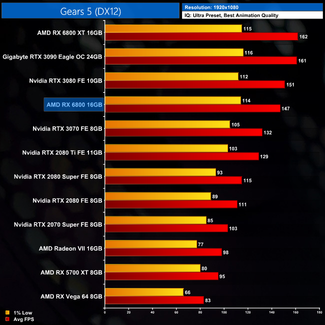 Moving on to Gears 5. This is an AMD-sponsored title and the RX 6800 does do well here. At 1440p, it is 13% faster than the RTX 3070, and 16% faster than Nvidia's previous flagship, the RTX 2080 Ti.