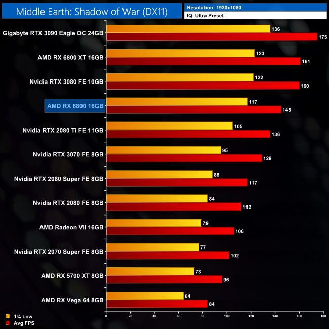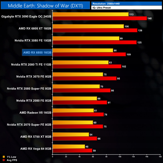 I was surprised by the results in Middle Earth: Shadow Of War. The RX 6800 gives a decent beating to the RTX 3070 in this DX11 title, as it delivers 15% better performance at 1440p.