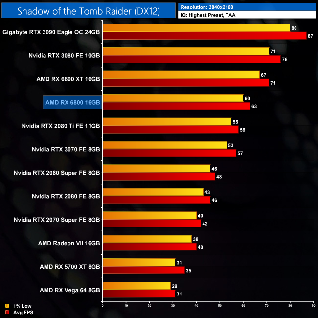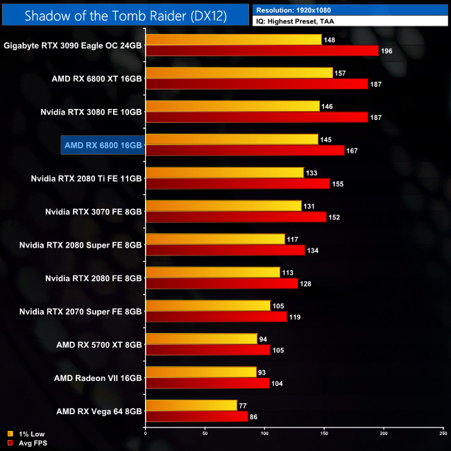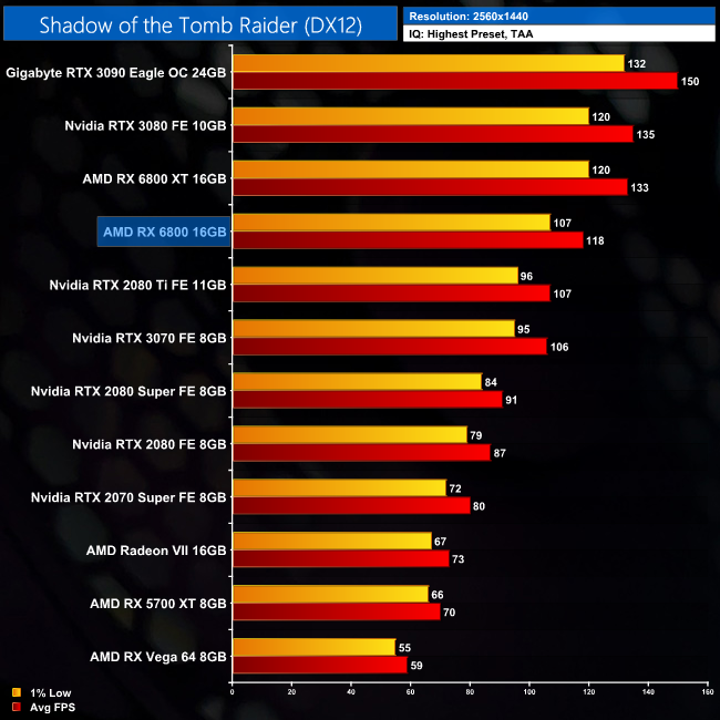 In Shadow of the Tomb Raider, we once more see a decent result for the RX 6800. At 1440p, the AMD GPU is 11% faster than the RTX 3070, and 10% faster than the RTX 2080 Ti, though all three GPUs are capable of delivering over 100FPS.