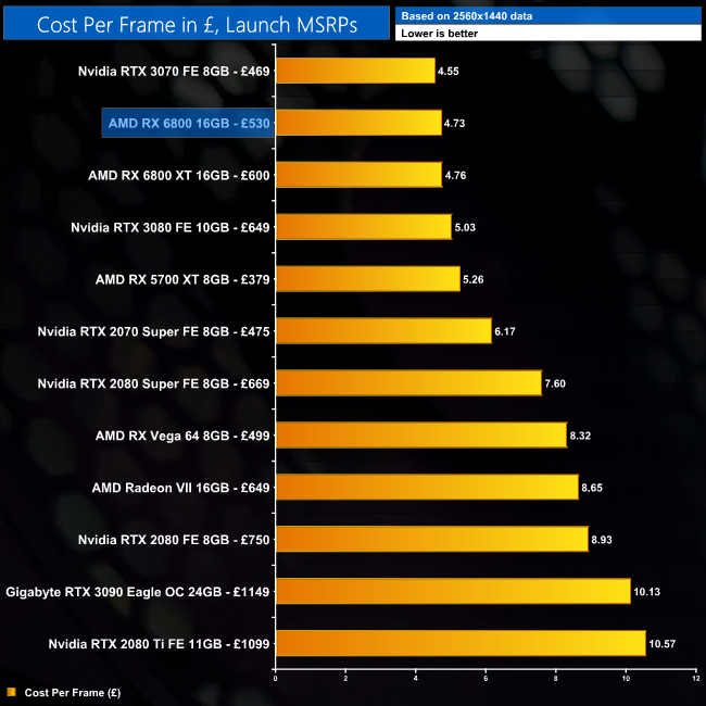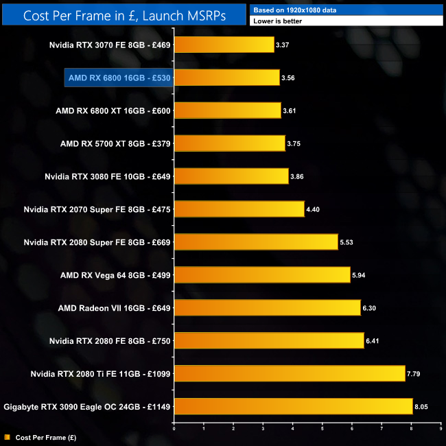 The cost per frame analysis shows us that the RX 6800 is better value than the RX 6800 XT at 1080p and 1440p, but not at 4K. The RTX 3070 is still the best value GPU overall though, but not by a whole lot – at 1440p, the RX 6800 is just 4% more expensive per frame.