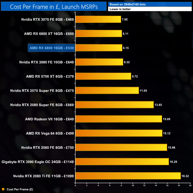 Using the average frame rate data presented on the previous page, here we look at the cost per frame using the UK MSRP launch prices for each GPU.