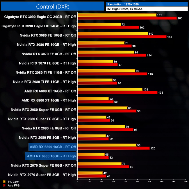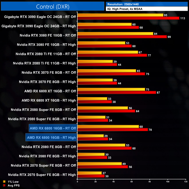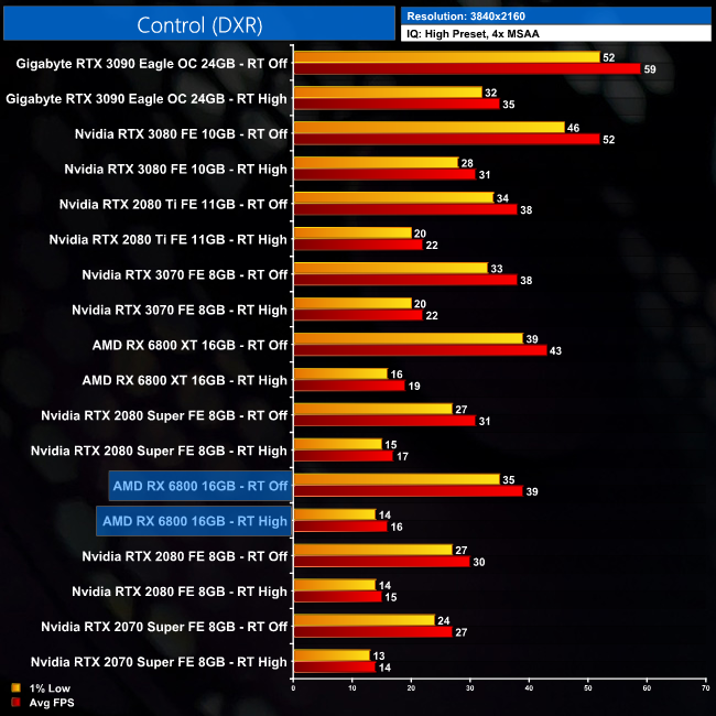 To assess the ray tracing performance of the RX 6800, we start with Control. This uses a number of ray traced effects and can be quite punishing. Here, the RX 6800 really only delivers a decent experience at 1080p, where it averages 52FPS with ray tracing at high settings. It averages 34FPS at 1440p, but the 1% lows dip down to 29FPS.