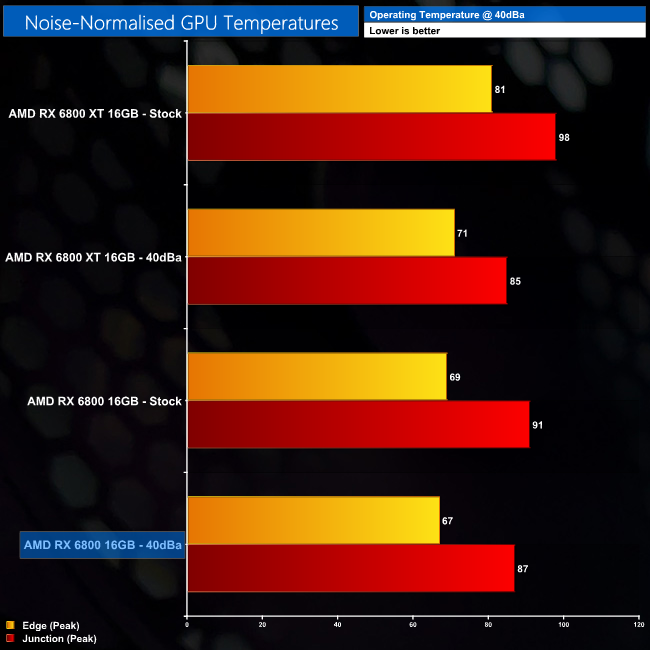As the RX 6800 produced 39dBa of noise at stock, noise normalising to 40dBa doesn't make a massive difference, as the end result is the fans spinning just 50rpm faster. Still, this reduced edge temperature by 2C, and junction temperature by 4C. It will be fascinating to see how AMD's partners can improve on this performance.