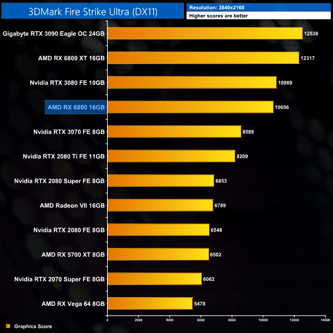 Starting proceedings with 3DMark. AMD's Navi GPUs have historically done well in these benchmarks, and the RX 6800 out-scores even the RTX 3080 in Fire Strike, delivering almost 44,000 points.