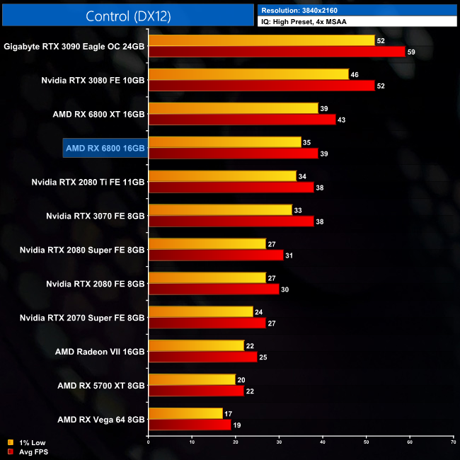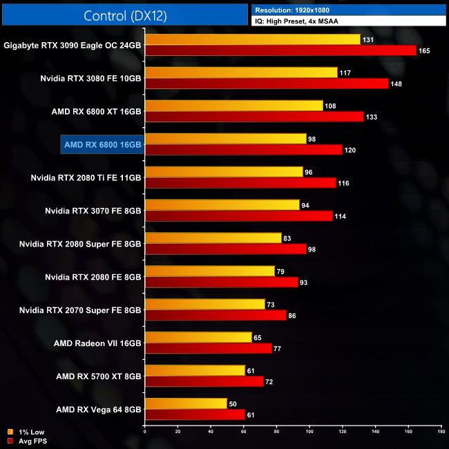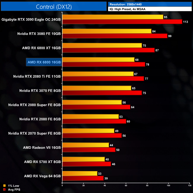 After a good start in Borderlands 3, Control brings the RX 6800 down a peg or two. At 1440p it averages 78FPS which is basically on par with both the RTX 3070 and RTX 2080 Ti. It is fractionally faster, yes, but not by any meaningful amount.