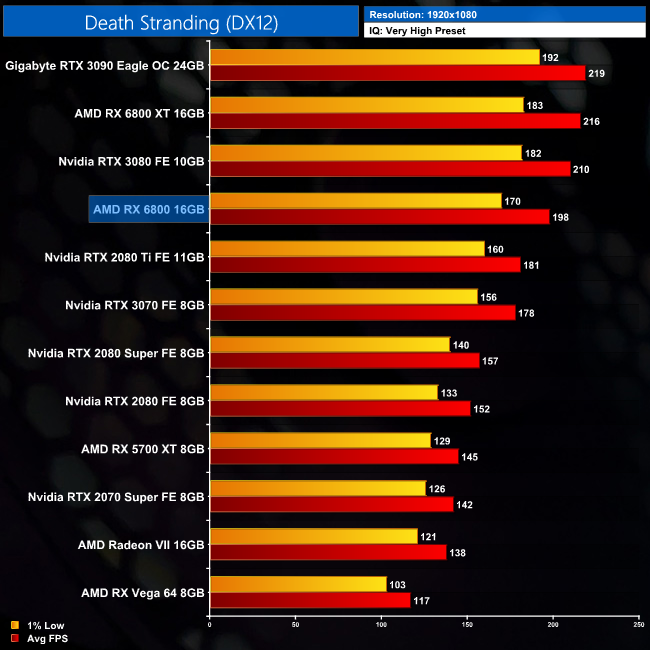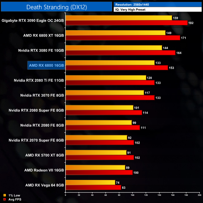 Death Stranding ups the ante and RX 6800 looks really good in this title. At 1440p it averages over 150FPS, making it 15% faster than both the RTX 3070 and RTX 2080 Ti. Not bad when you consider that, up until a couple of months ago, the 2080 Ti was selling for over £1000.