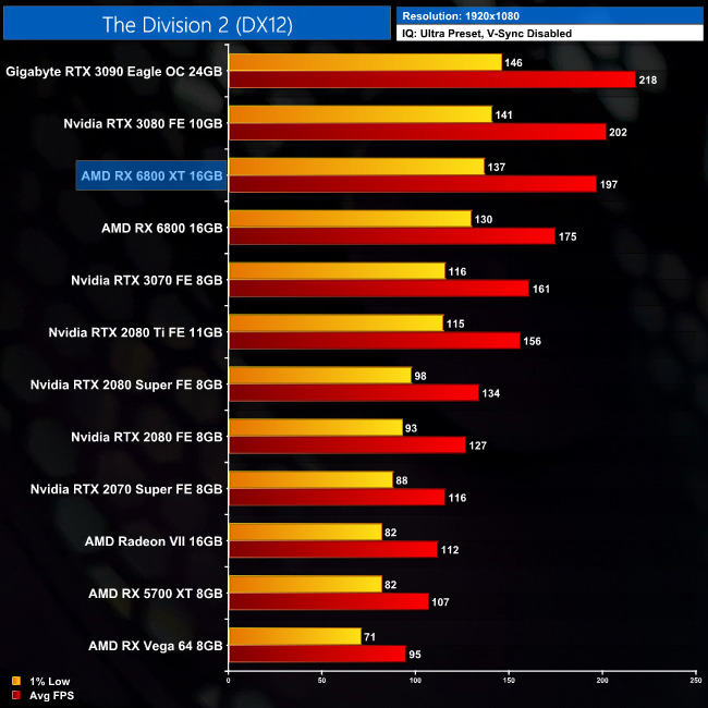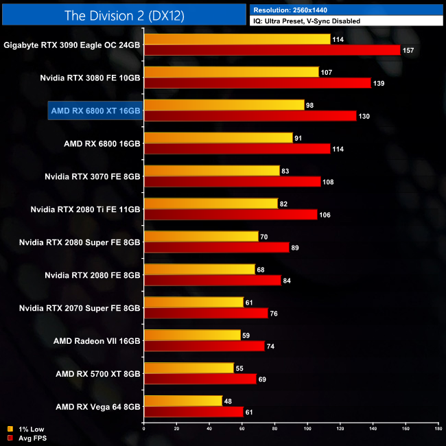 Moving on to The Division 2, at 1440p we can see the RX 6800 XT delivering 130FPS on average. That's nine frames less than the RTX 3080, a difference of 6%. Compared to Nvidia's next-closest GPU, the RTX 3070, we're looking at a 20% gain for the 6800 XT, but of course it is a fair bit more expensive.
