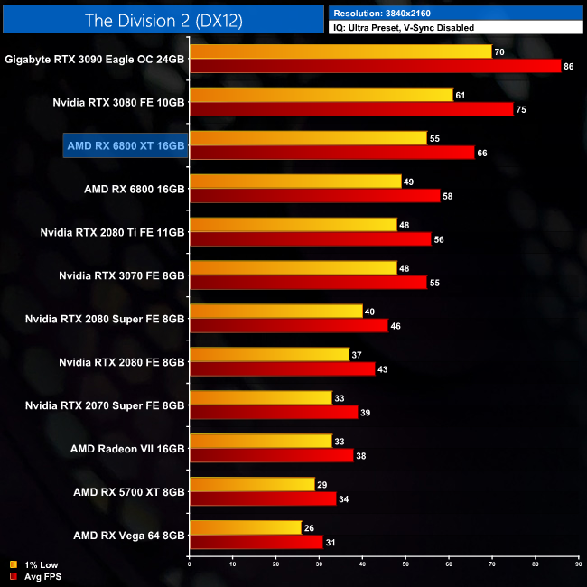 At 4K, the RTX 3080 does begin to stretch its legs, and the RX 6800 XT falls further behind. It's still averaging over 60FPS, but it is now 12% slower than the RTX 3080.