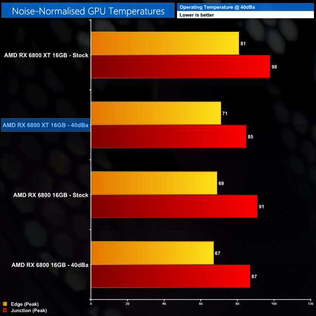 As the 6800 XT is so quiet in its out of the box state, we re-tested its thermal performance but with noise levels fixed at 40dBa. This meant increasing the fan speed from 1350rpm up to 1720rpm, resulting in a 10C reduction to the peak edge temperature. Meanwhile, the junction temperature dropped from 98C to 85C.