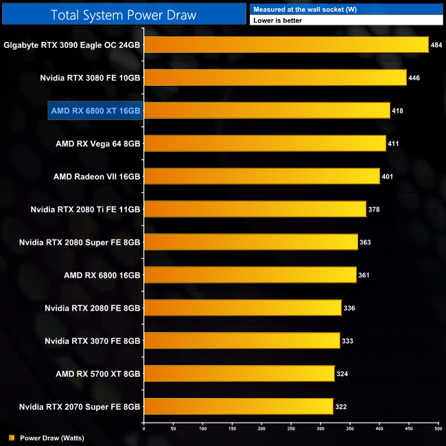 Total system power draw for the RX 6800 XT is a little higher than Vega 64, but still well below RTX 3080 levels of power.