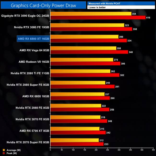 We get a much clearer picture looking at graphics card-only power draw. Here, the RX 6800 XT stays true to its 300W TBP rating, as we saw power draw average 298W across our 30 minute stress test. This is 25W less than the RTX 3080, and only 10W more than Vega 64 despite offering significantly better performance.