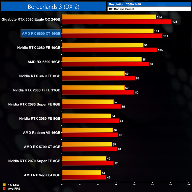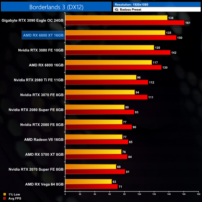 Our first game of the day is Borderlands 3, one of the titles that AMD used to tease RX 6000-series performance with. At 1440p, the 6800 XT produced 111FPS on average, which is 6% faster than the RTX 3080, and only 9% slower than the RTX 3090, so it's definitely a good result for Team Red.