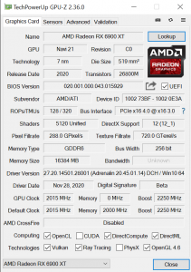 Rated clock speed is also identical between these two RDNA 2 GPUs. This means the RX 6900 XT has a rated game clock of 2015MHz and a rated boost clock of up to 2250MHz. To put that into perspective, the RX 5700 XT has a rated game clock of 1755MHz.