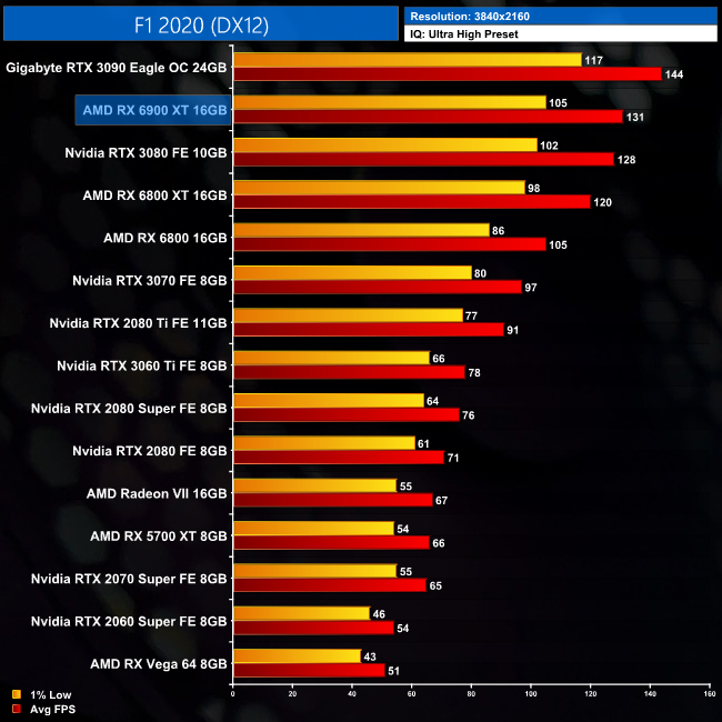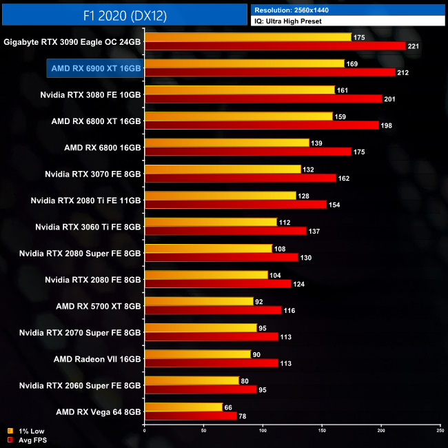 Next we come to F1 2020, and it's no surprise to see the 6900 XT pushing over 200FPS in this title when looking at the 1440p data. That puts it pretty neatly in between the RTX 3080 and 3090, as it is 5% faster than the 3080 but 4% behind the 3090.