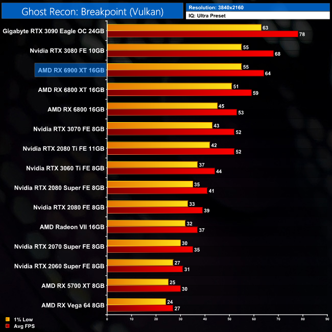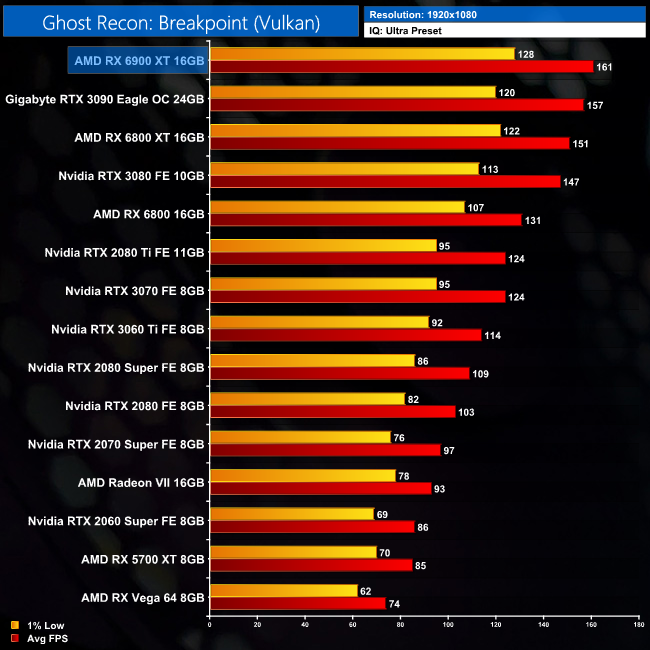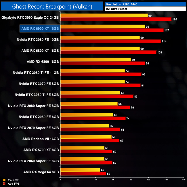 Now, Ghost Recon: Breakpoint is another AMD title, but Nvidia GPUs actually do pretty well in this one. At 1440p, the 6900 XT is just 3% faster than the RTX 3080, and it's 7% behind the RTX 3090.