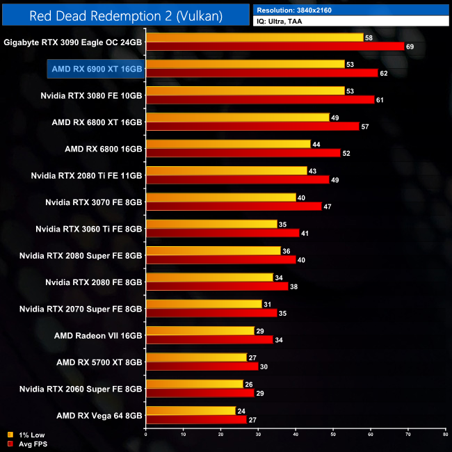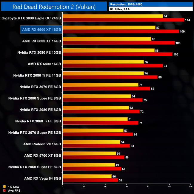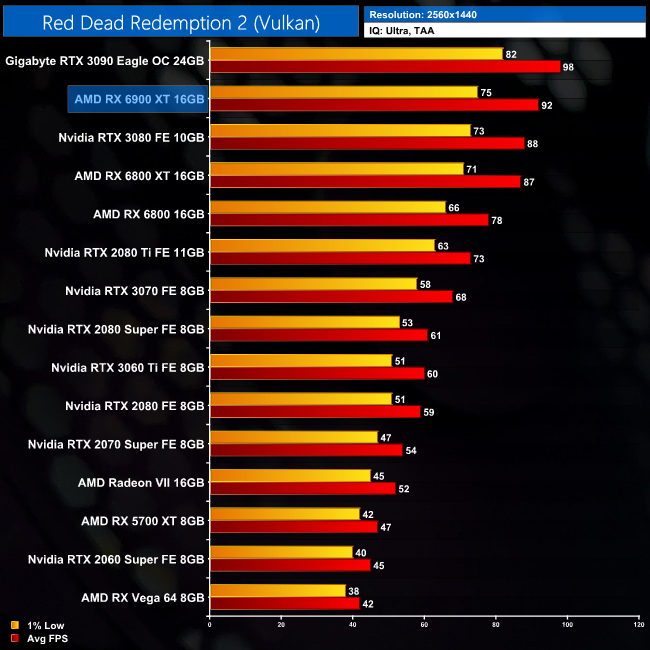 Read Dead Redemption 2 is always an interesting one to look at, and at 1440p the 6900 XT slots right between the RTX 3080 and 3090. It's 5% faster than the 3080, but 6% slower than the 3090.