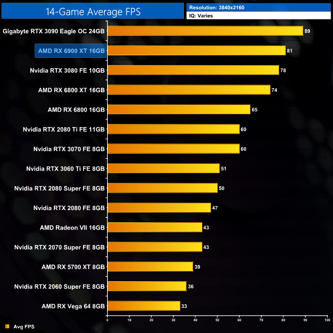 Looking at the big picture overview, there is a fair bit of variation through the different resolutions. At 1440p, the 6900 XT is on average 7% faster than its little brother, the 6800 XT, while it is 5% faster than the RTX 3080. Compared to the RTX 3090 however, it is 6% slower.