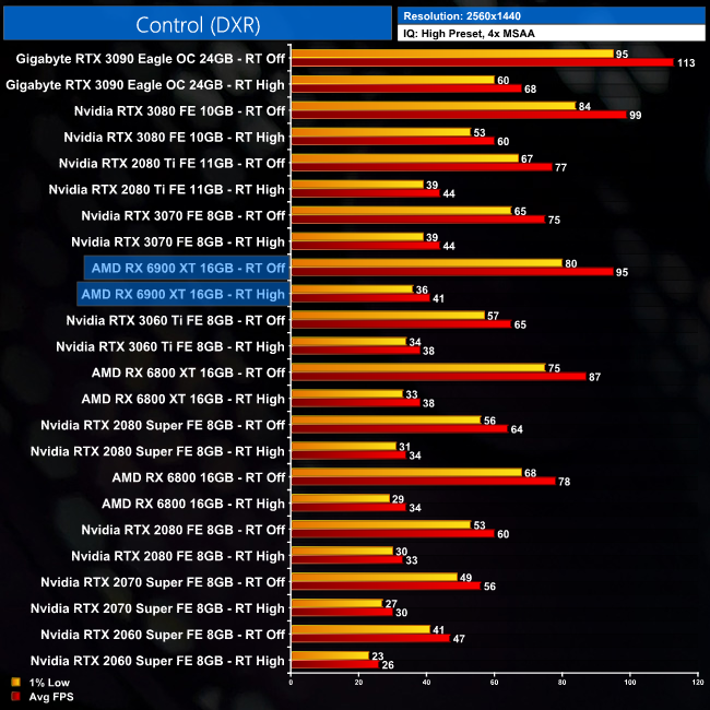 As for 1440p, the average frame rate falls to 41FPS, and that's a 57% performance hit compared to playing with ray tracing disabled. The 6900 XT is now 32% slower than the RTX 3080.
