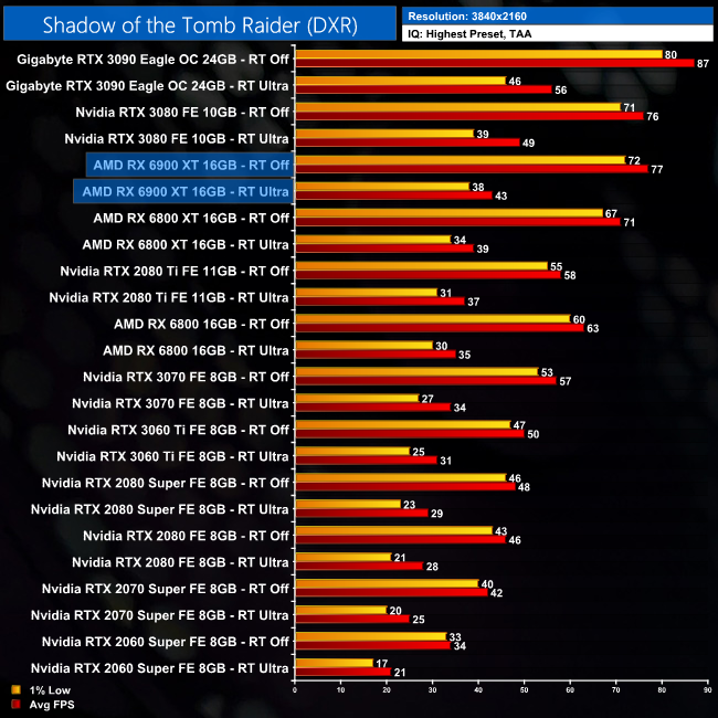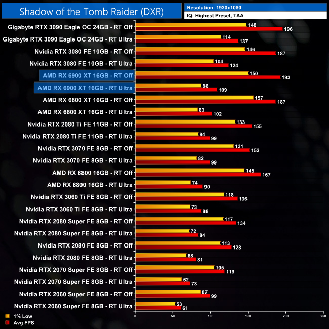 Next up, Shadow of the Tomb Raider only uses ray traced shadows, and this means the performance hit is less severe for the 6900 XT. At 1080p, it delivers 109FPS with ray tracing set to Ultra, putting it 12% behind the RTX 3080.
