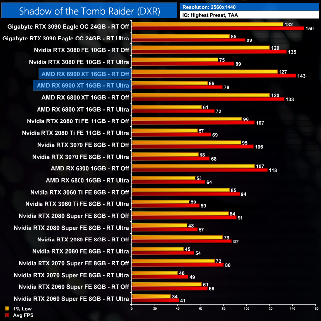 At 1440p, it can still hold over 60FPS with those ray traced shadows, and it's still about 11% behind the RTX 3080. Compared to ray tracing disabled, we're looking at a 45% hit for the 6900 XT here.