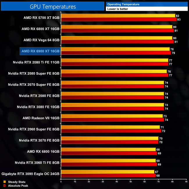 Looking at thermal performance, despite using the same cooler design as the 6800 XT, we saw the 6900 XT run fractionally cooler in terms of the edge temperature, hitting a peak of 79C, with a steady state of 78C, so it's a couple of degrees cooler than the 6800 XT.