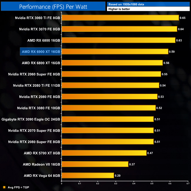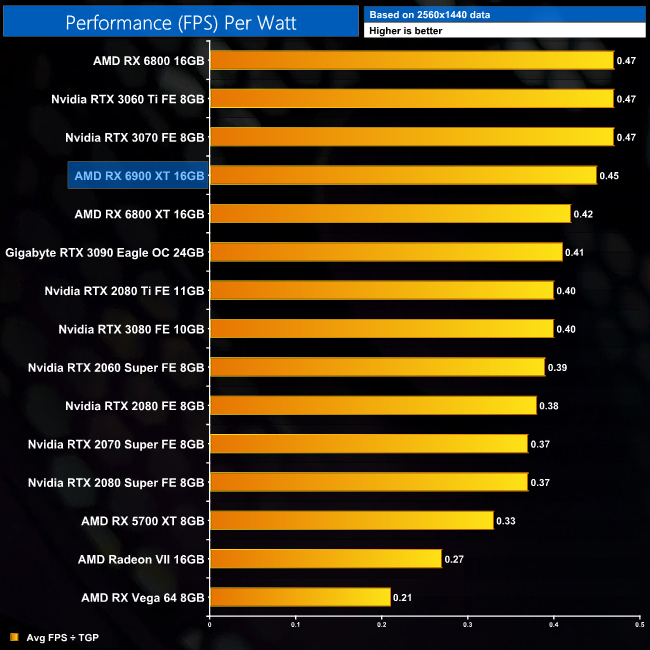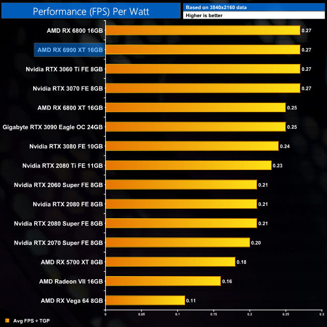Considering the 6900 XT consumes the same power as the 6800 XT, but runs 7-9% faster on average, it's no surprise to see it delivers better performance per Watt across the board. At 1440p, for instance, it is 7% more efficient, and only just behind the RX 6800 and RTX 3060 Ti.