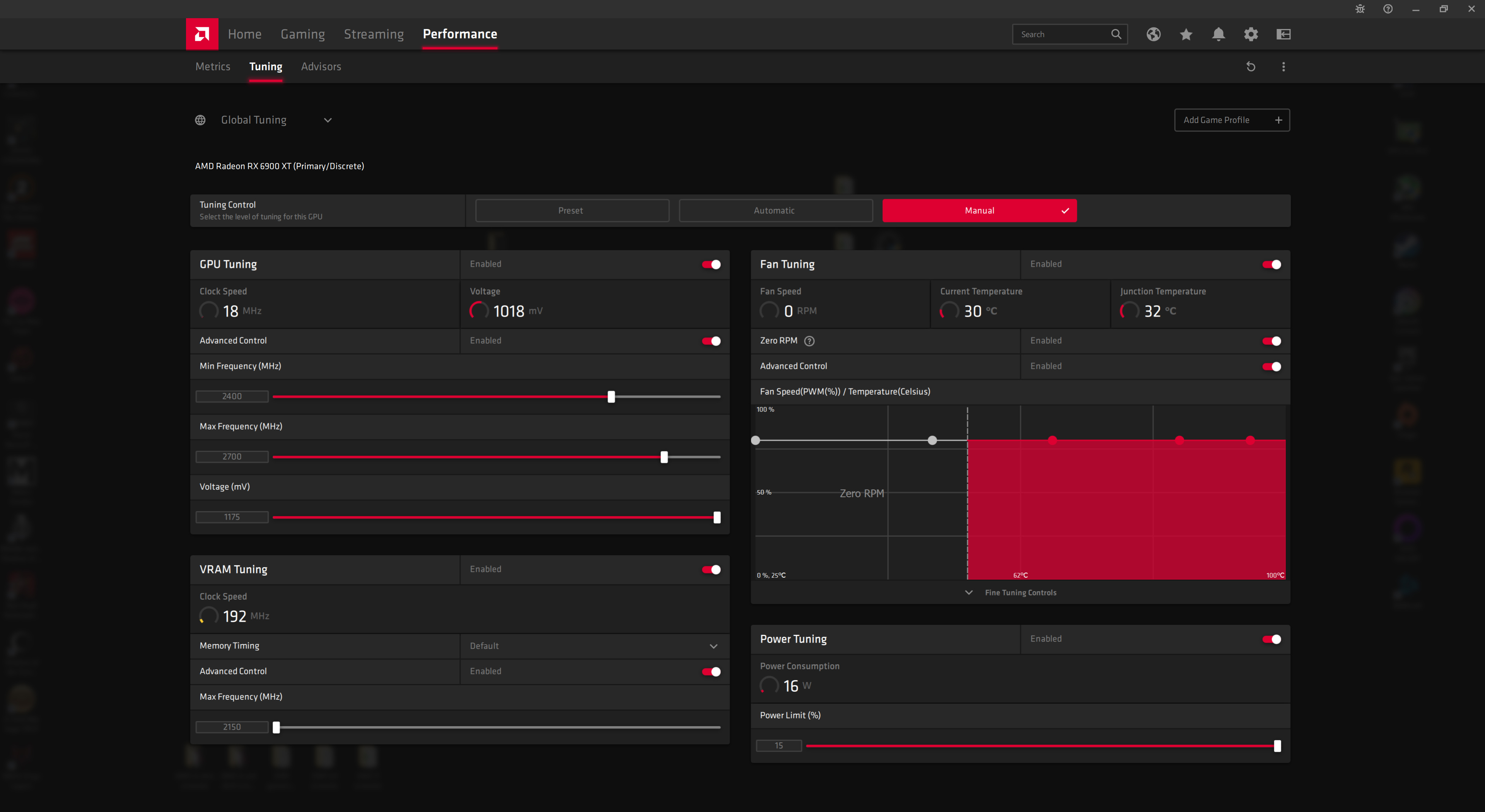 For manual overclocking, we used AMD Wattman. Our best result came with the power slider maximised, the memory frequency slider maximised at 2150MHz, and a GPU frequency set to 2400MHz minimum and 2700MHz maximum. In practice, this resulted in the GPU running around 2450MHz.