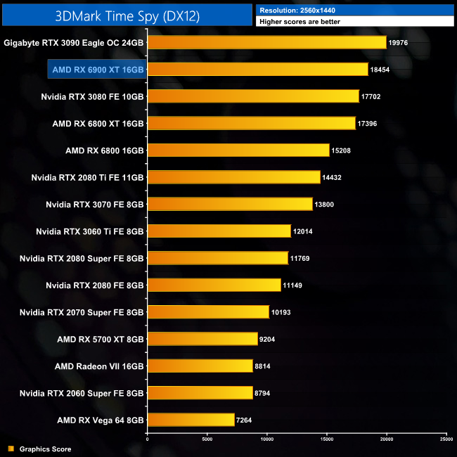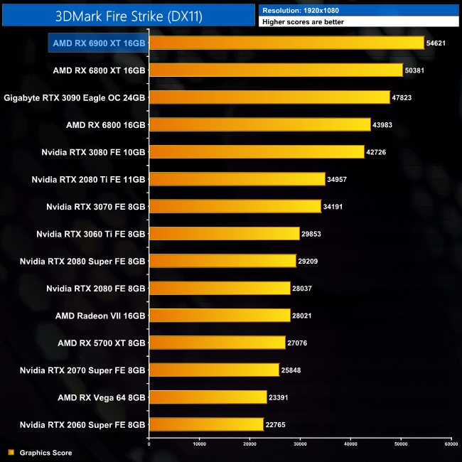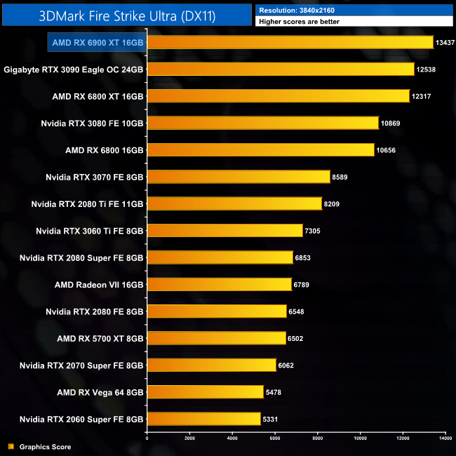 Starting with the 3DMark scores, we already saw chart-topping performance from the RX 6800 XT in Fire Strike, and the RX 6900 XT extends AMD's lead by another 8%, delivering a score of almost 55,000. The gains are smaller in Time Spy, where the 6900 XT scores just 6% higher than the 6800 XT, but in Fire Strike Ultra it is 7% faster than even the RTX 3090.