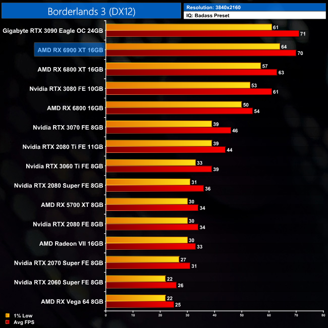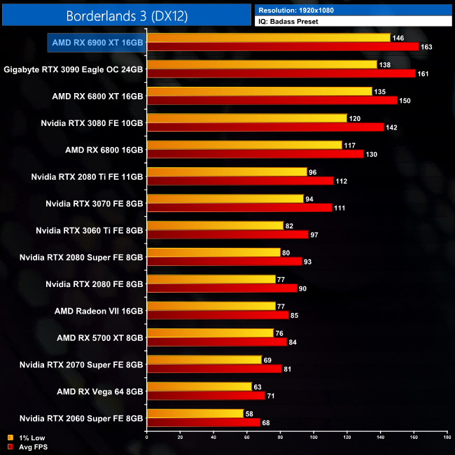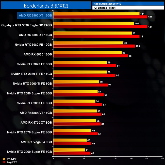 Our first game of the day is Borderlands 3, with the RX 6900 XT delivering some excellent results in this AMD title. At 1440p, it delivers an average frame rate of 121FPS, which is exactly equal to the RTX 3090, but the AMD GPU does do a bit better in terms of the 1% lows. This result puts it 15% ahead of the RTX 3080 and 9% ahead of the RX 6800 XT.