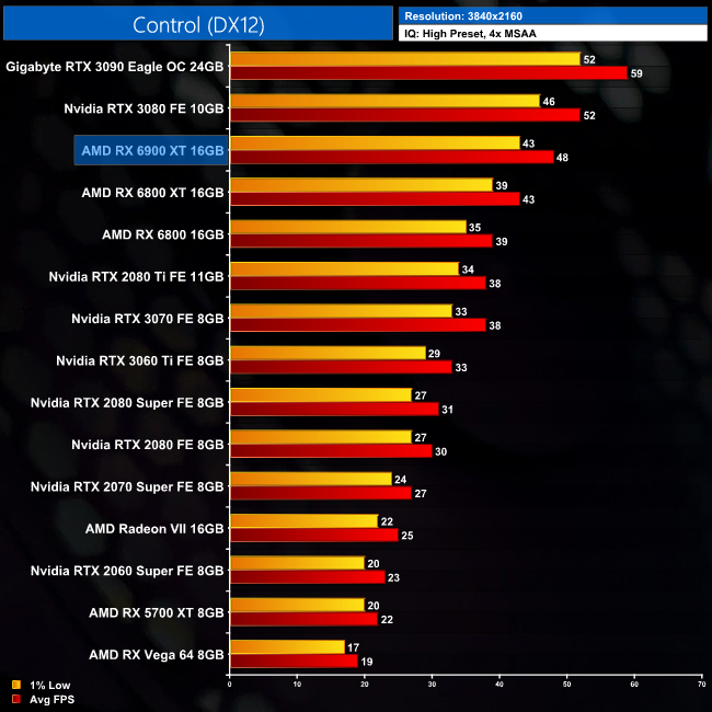 At 4K, the average frame rate drops to 48FPS, which sees the 6900 XT fall 8% behind the RTX 3080 and 19% behind the RTX 3090. Compared to the 6800 XT though, it's 12% faster.
