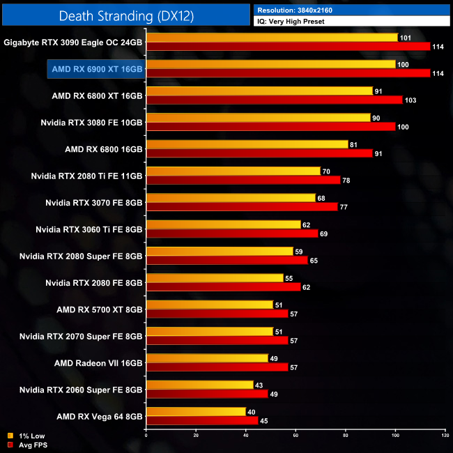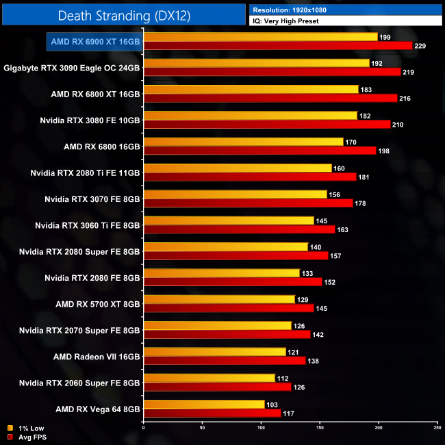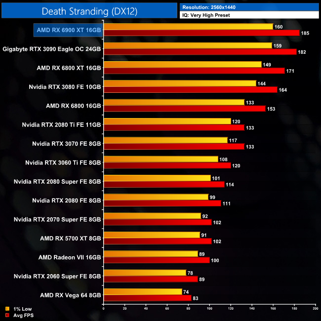 Moving onto Death Stranding, once more we see the 6900 XT at the top of the chart, delivering 185FPS at 1440p, giving it a 2% lead over the RTX 3090. This isn't miles ahead of the 6800 XT though, as it's 8% faster, but it's also 13% faster than the RTX 3080.