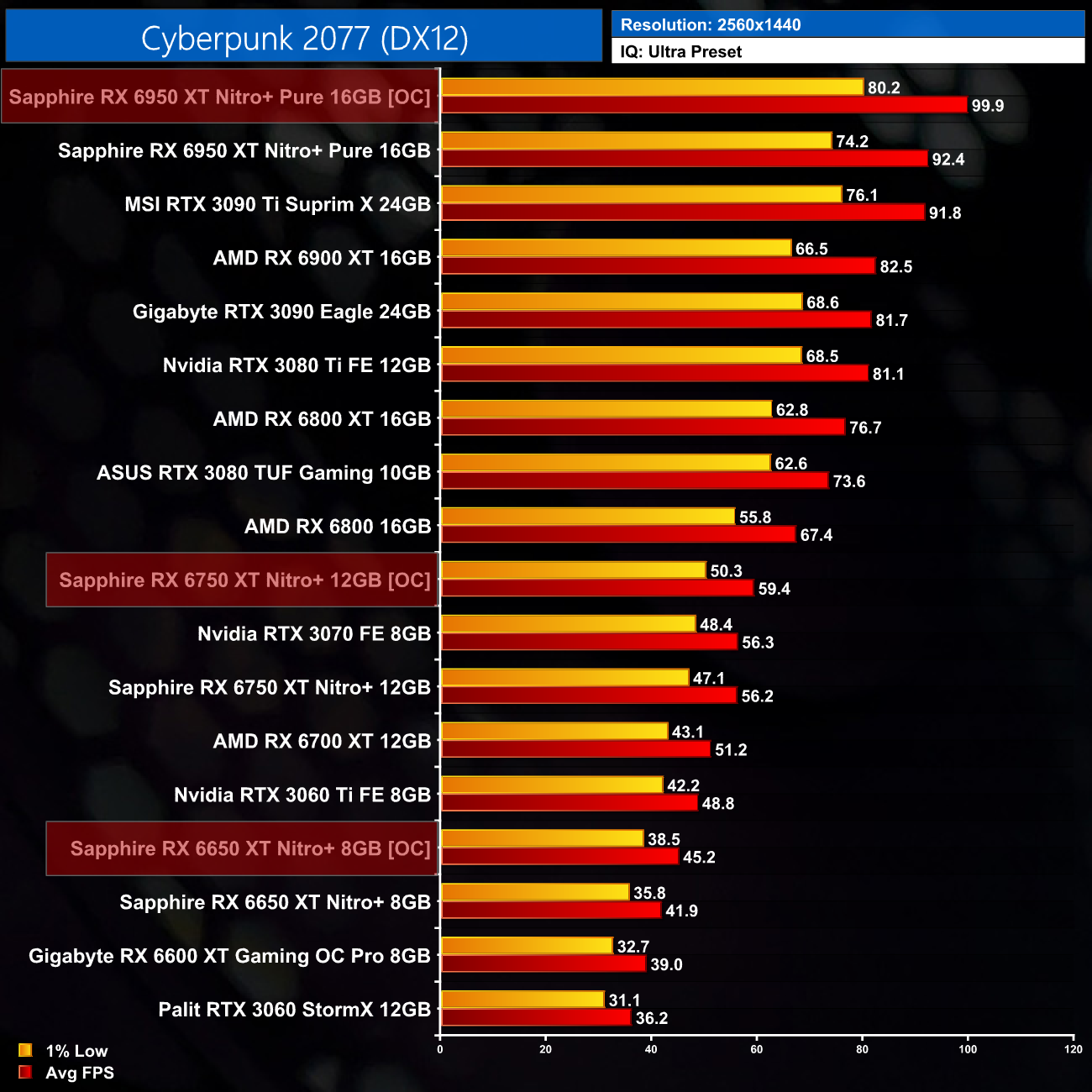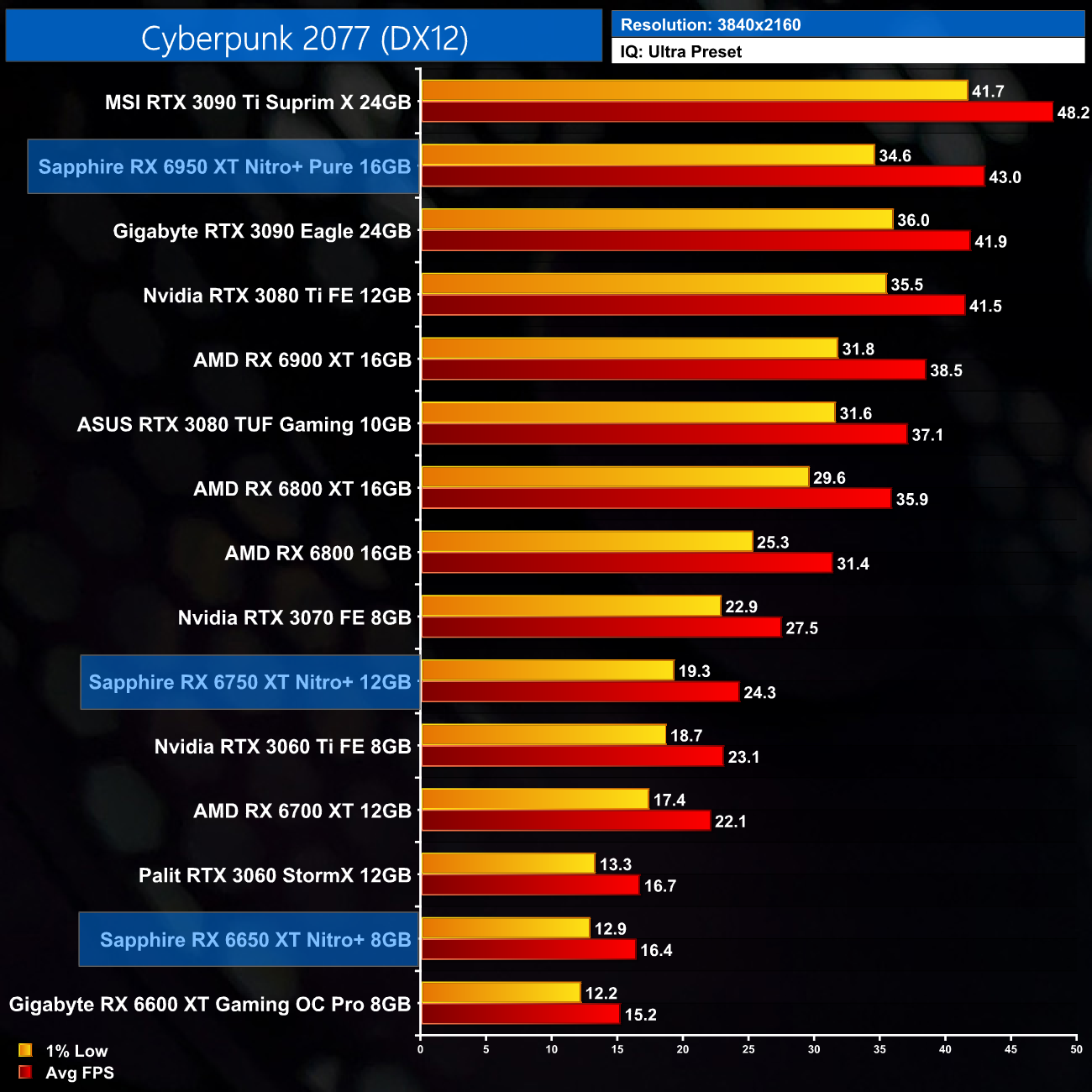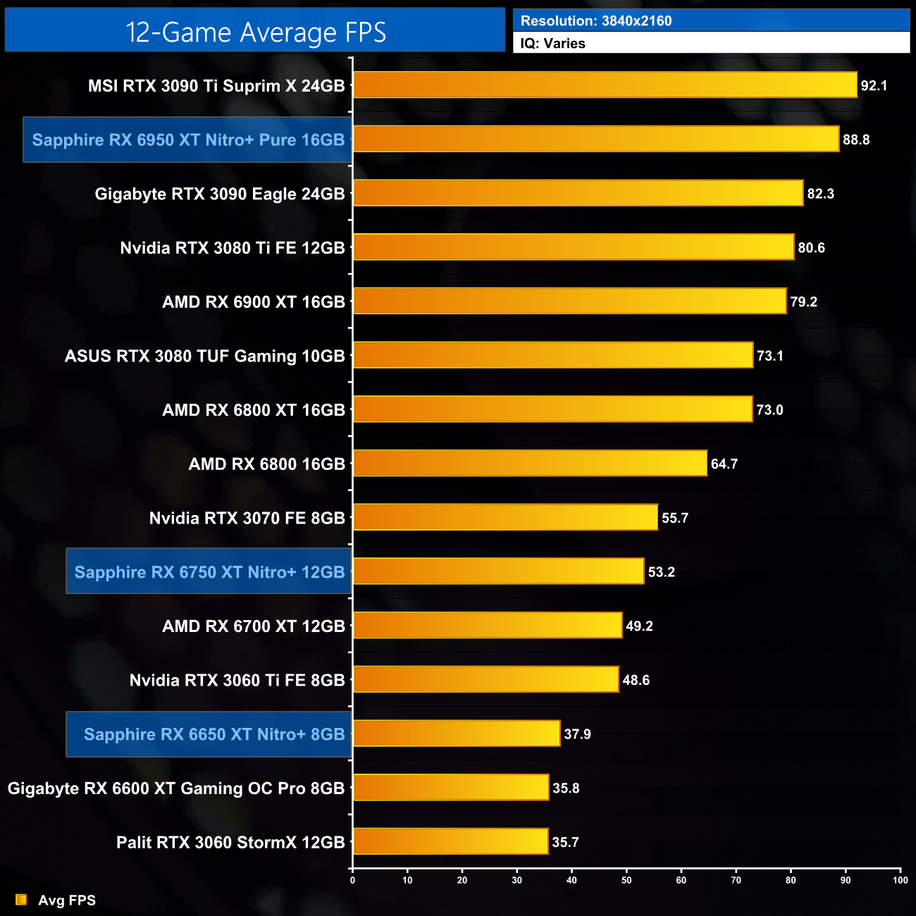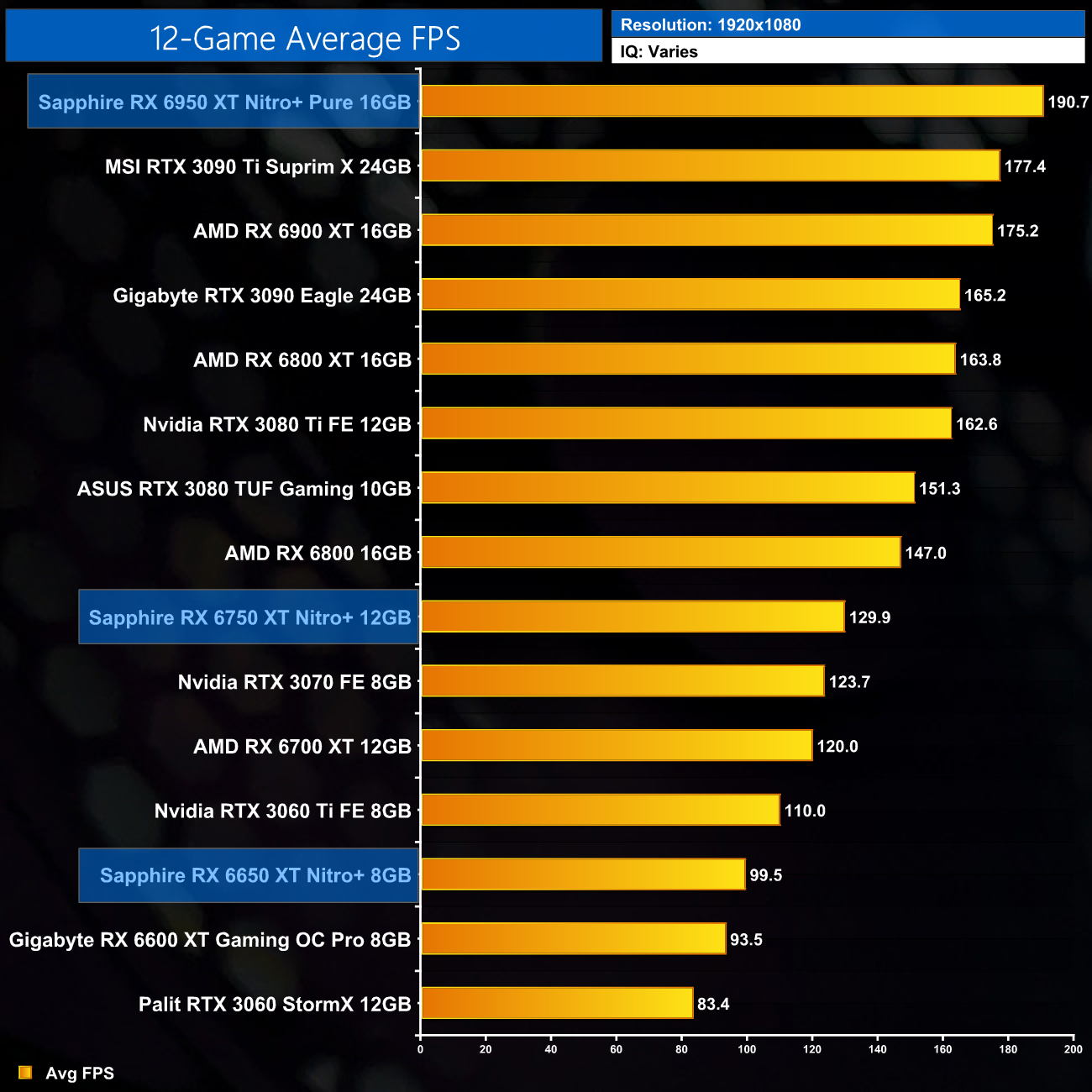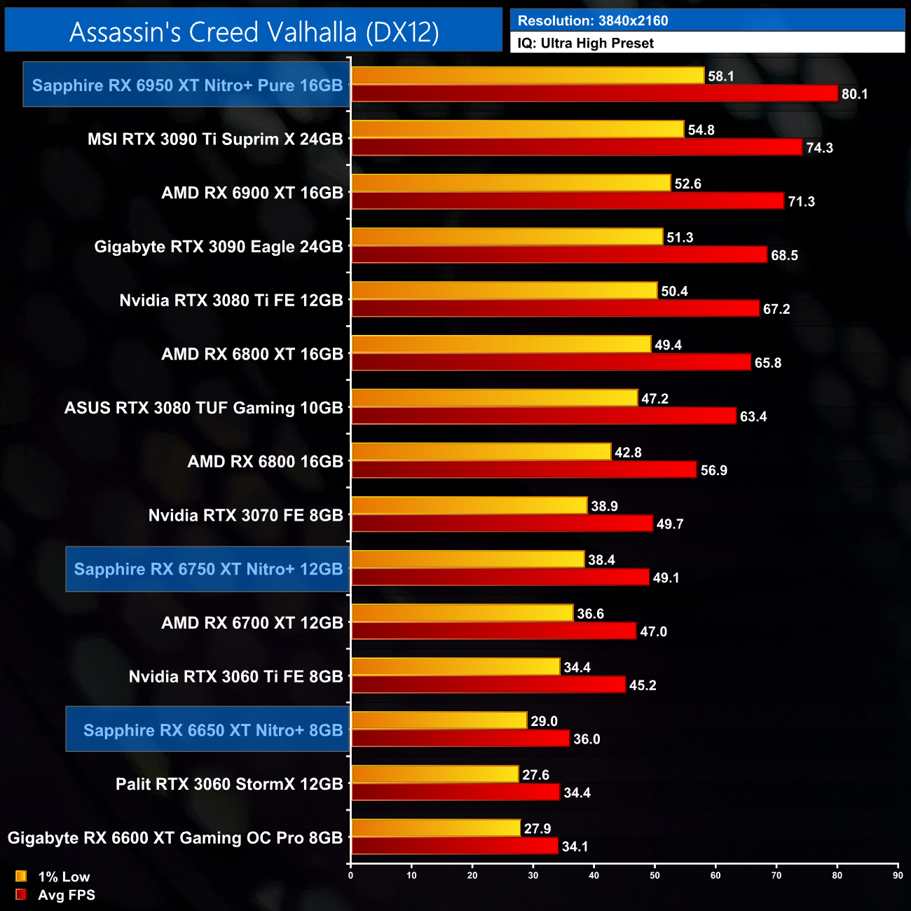 Just to re-iterate as well, these numbers don't take into account the fact that we tested three heavily factory overclocked models from the the Sapphire Nitro+ series, while our comparison cards were all tested at reference clocks. That means, if we were testing reference models against reference models, I would expect smaller margins than what is shown here – the Nitro+ Pure RX 6950 XT has an 11% factory overclock for instance, which would definitely boost performance by a decent chunk compared to a reference card.