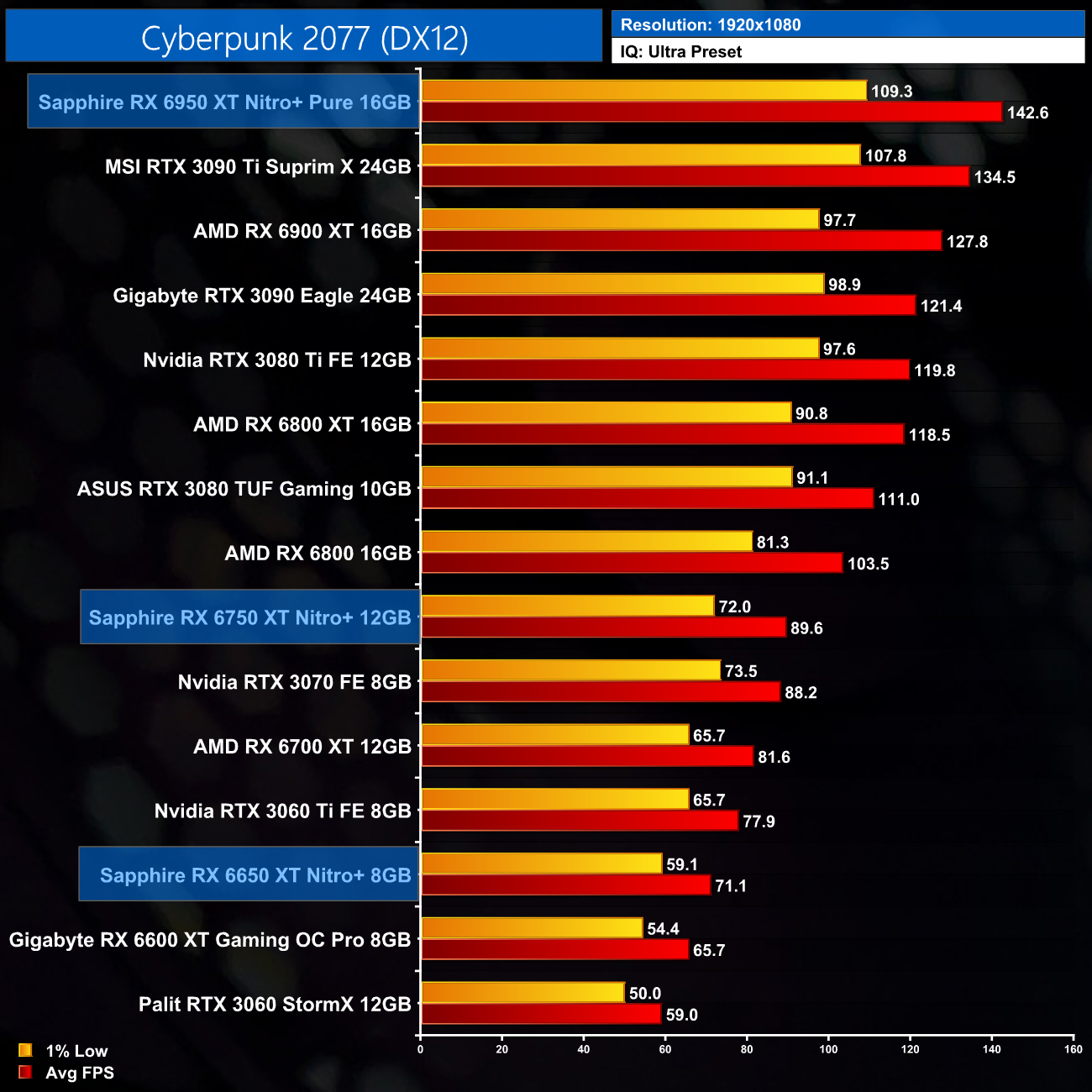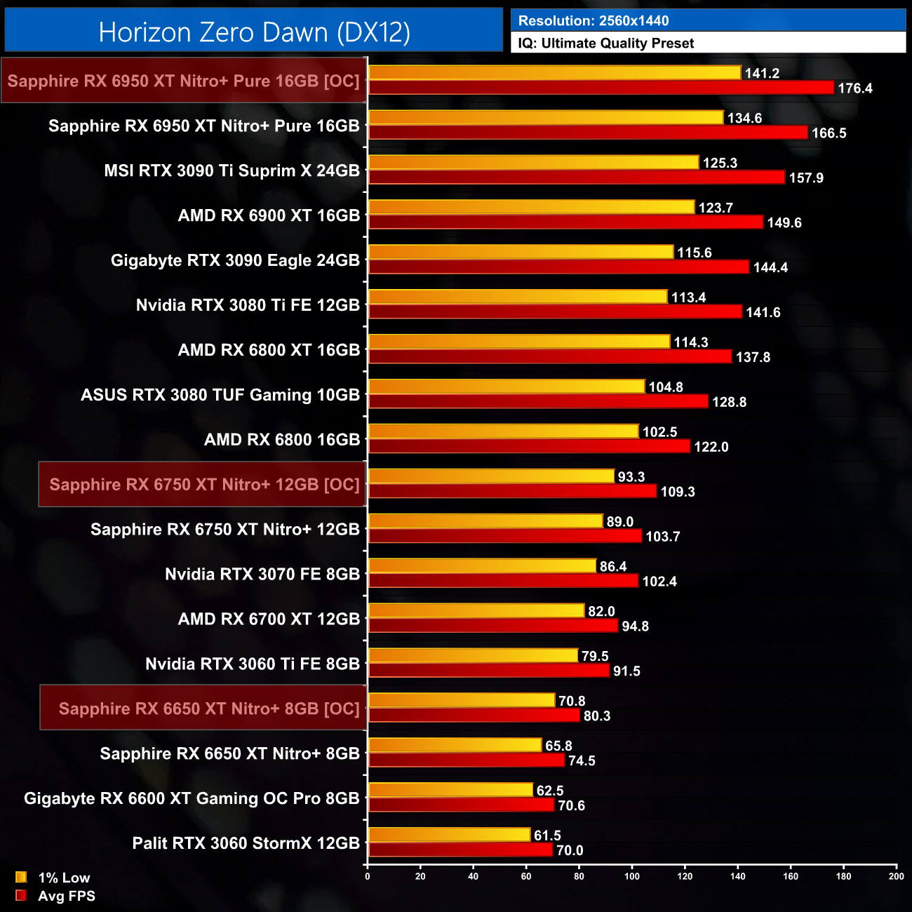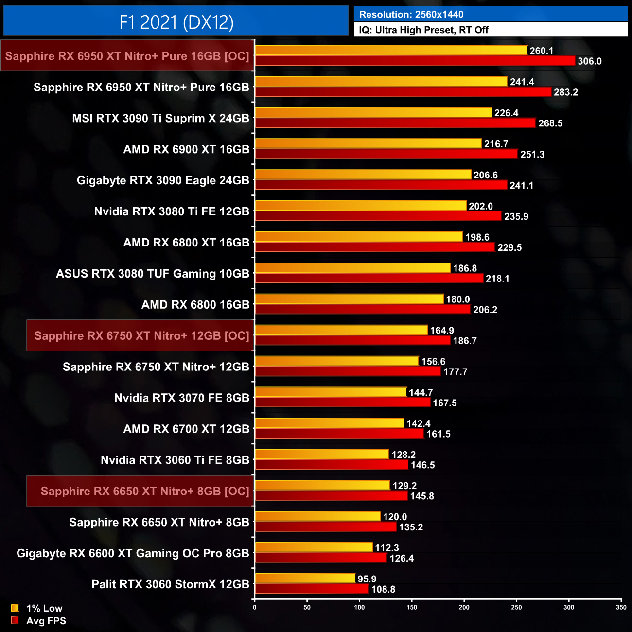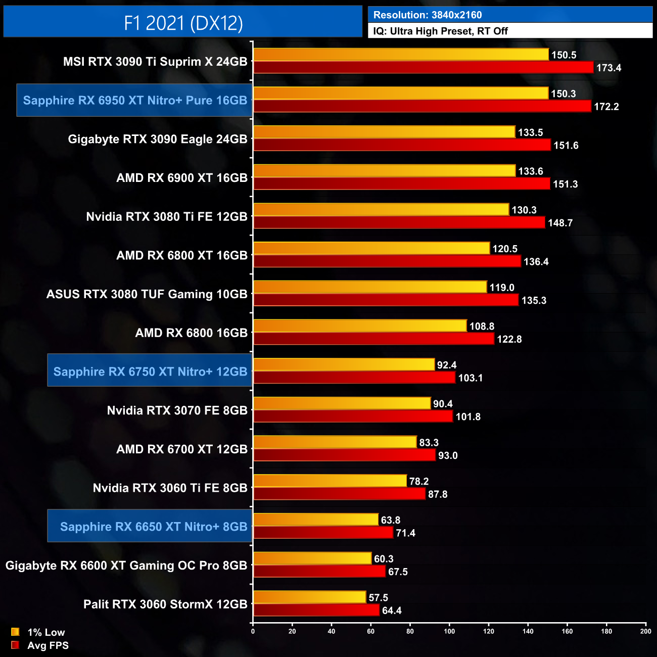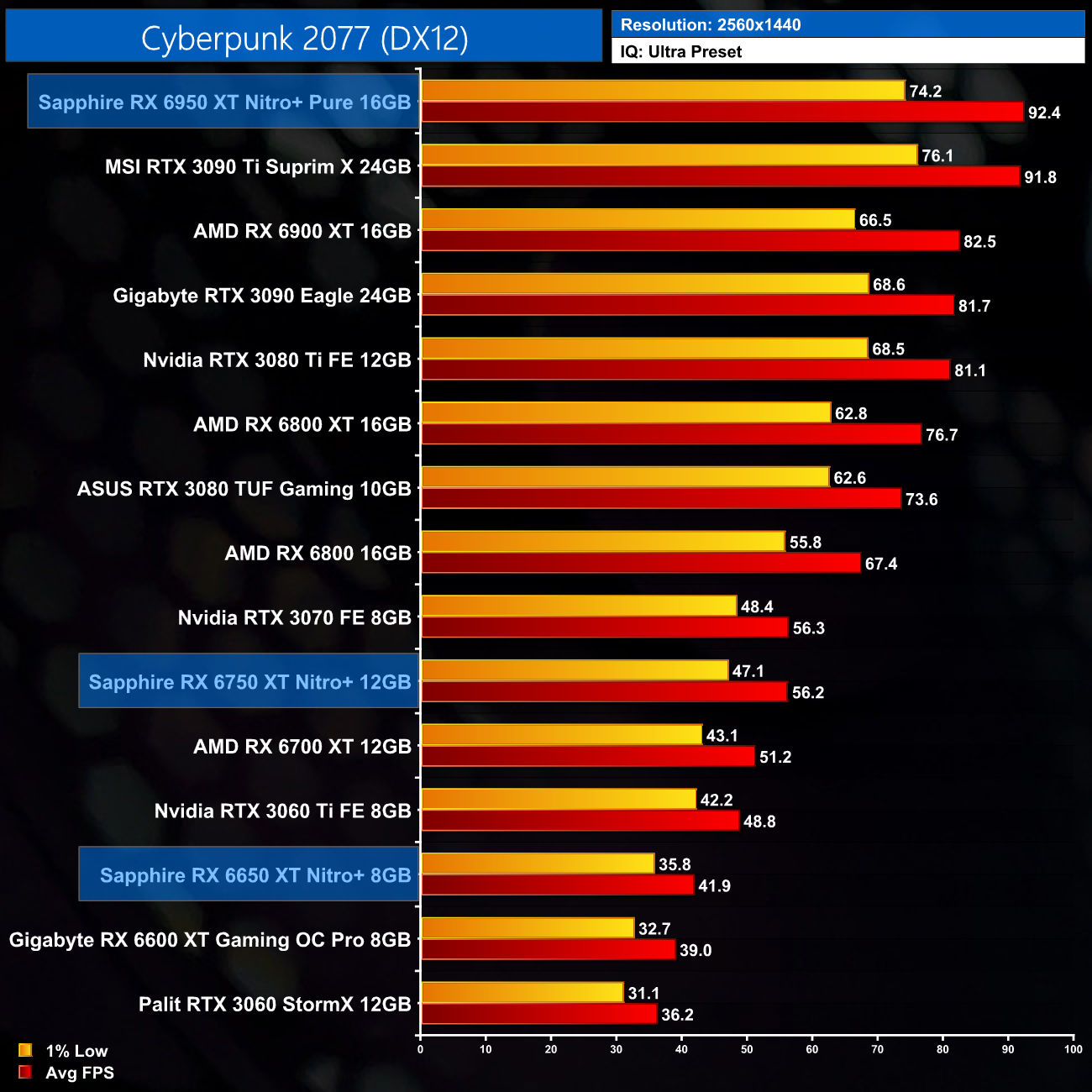 Just to re-iterate as well, these numbers don't take into account the fact that we tested three heavily factory overclocked models from the the Sapphire Nitro+ series, while our comparison cards were all tested at reference clocks. That means, if we were testing reference models against reference models, I would expect smaller margins than what is shown here – the Nitro+ Pure RX 6950 XT has an 11% factory overclock for instance, which would definitely boost performance by a decent chunk compared to a reference card.