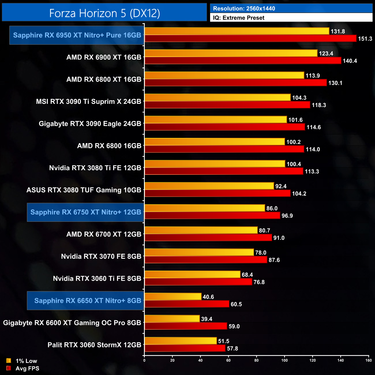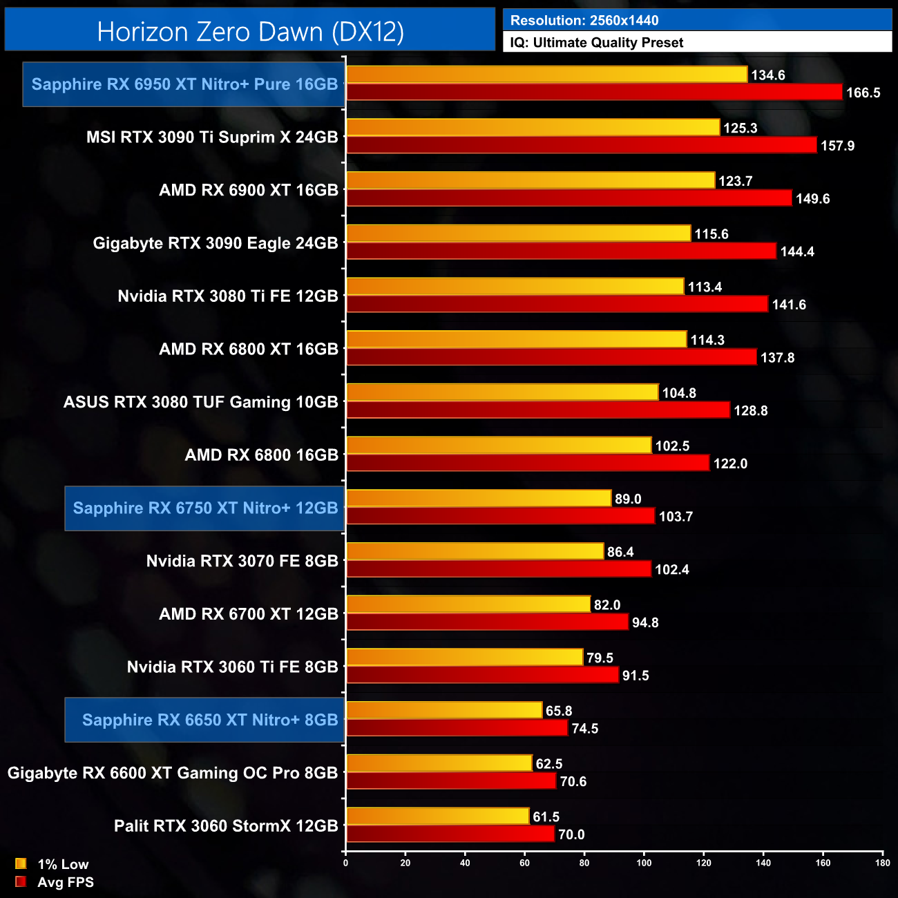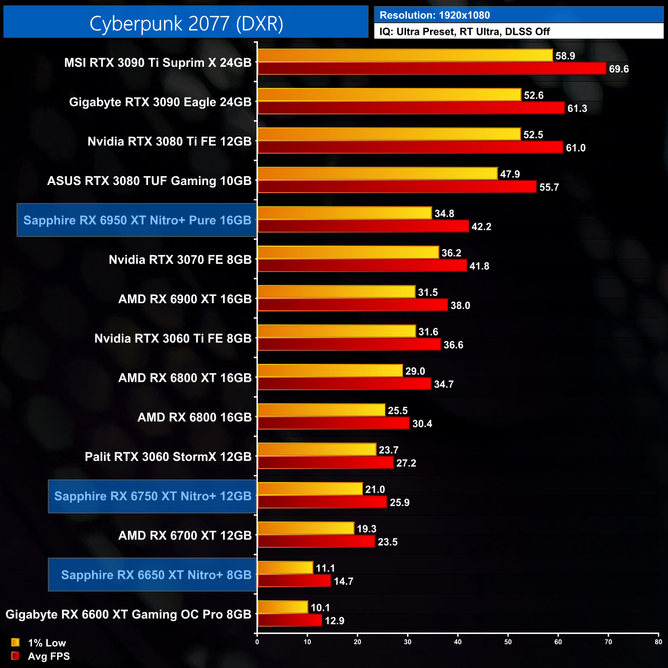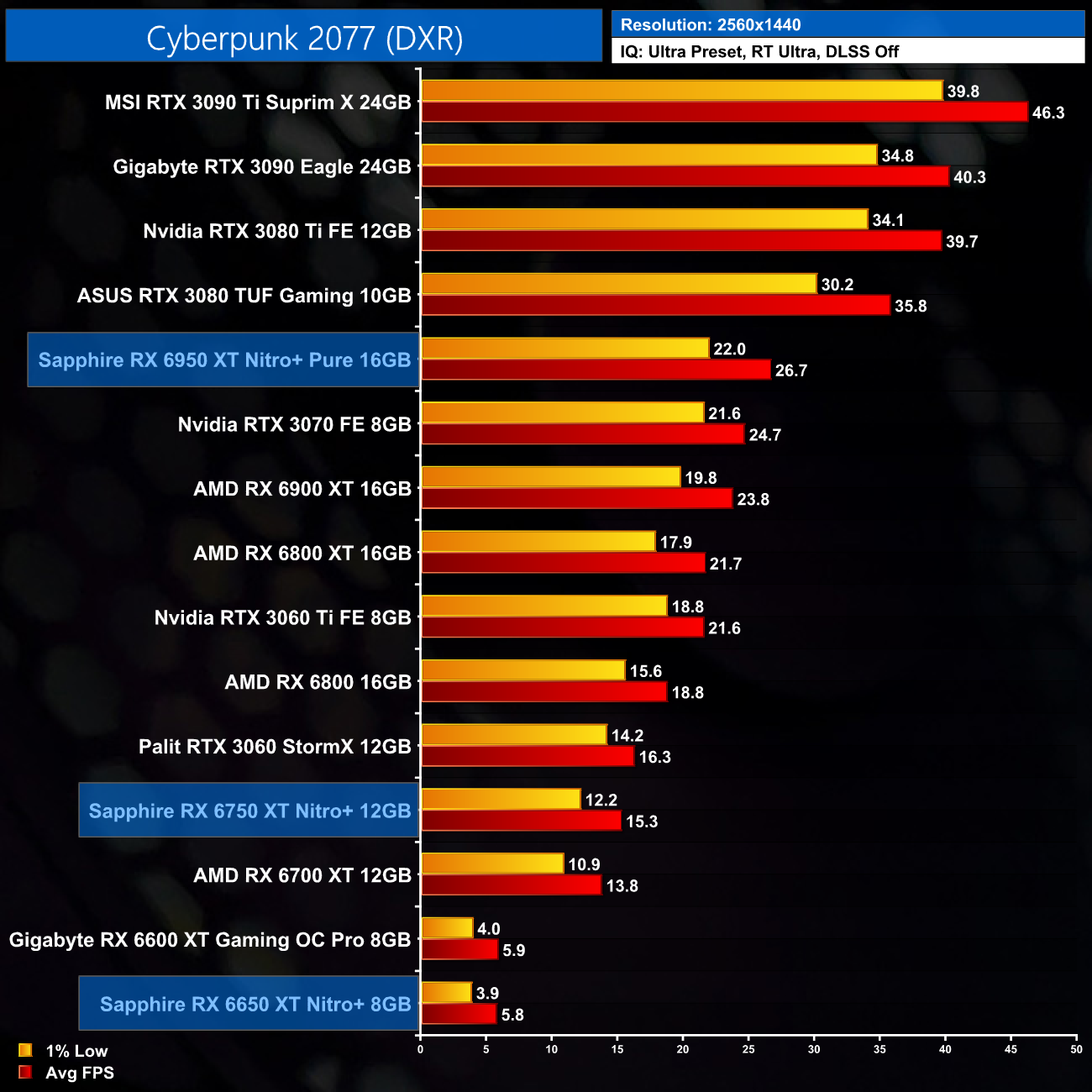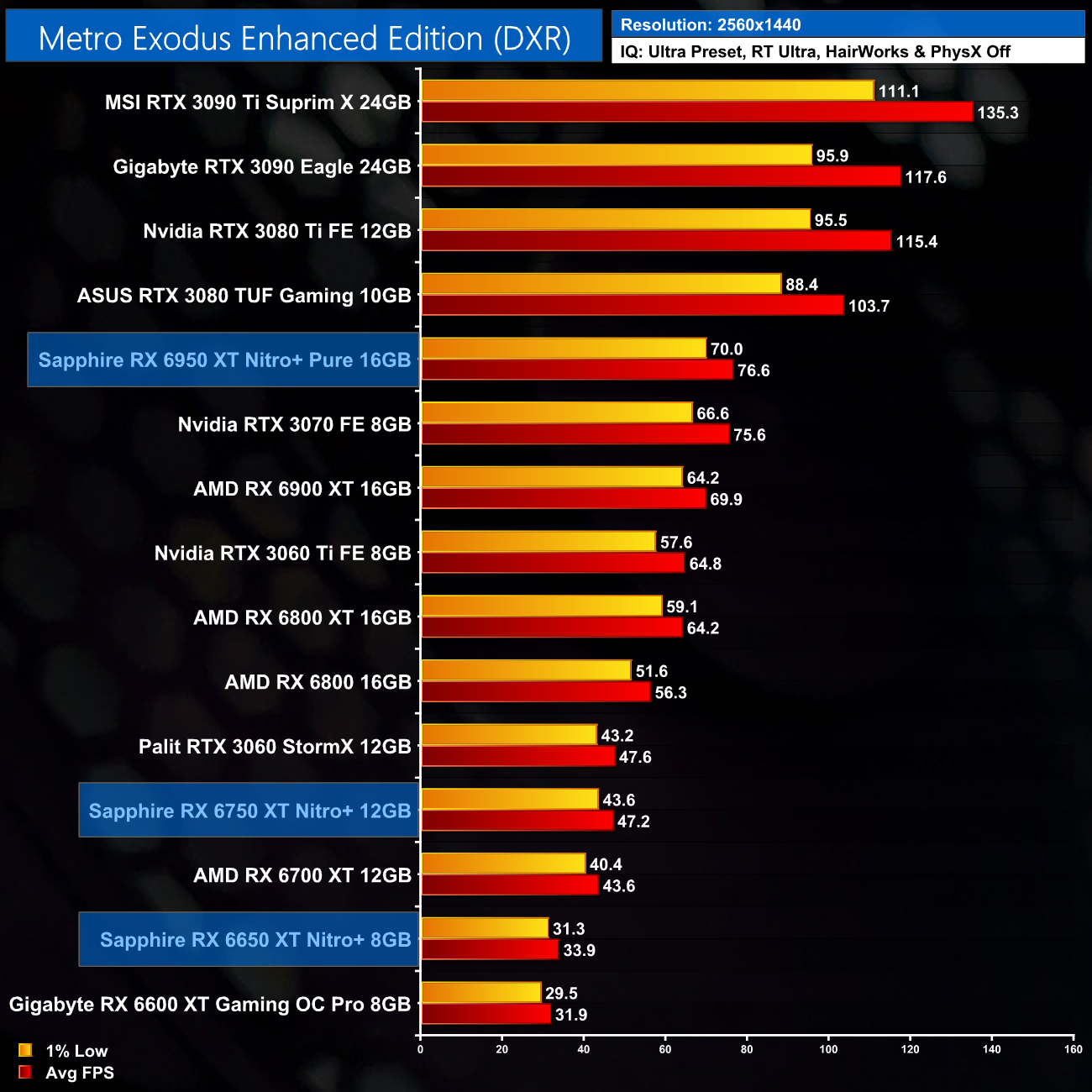 Just to re-iterate as well, these numbers don't take into account the fact that we tested three heavily factory overclocked models from the the Sapphire Nitro+ series, while our comparison cards were all tested at reference clocks. That means, if we were testing reference models against reference models, I would expect smaller margins than what is shown here – the Nitro+ Pure RX 6950 XT has an 11% factory overclock for instance, which would definitely boost performance by a decent chunk compared to a reference card.